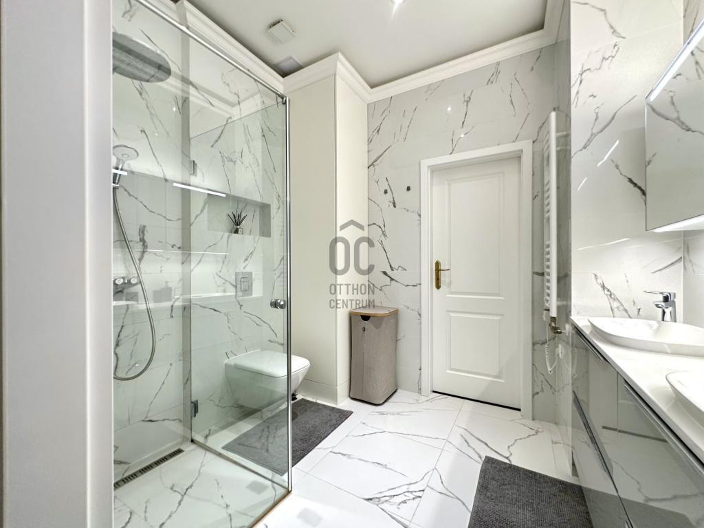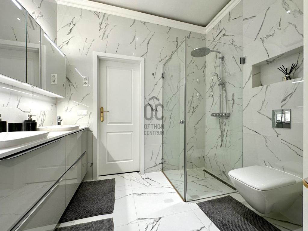 - A közlekedőből is megközelíthető, zuhanyzós fürdőszobában Laufen szaniterek és Hansgrohe csaptelepek lettek felszerelve.
