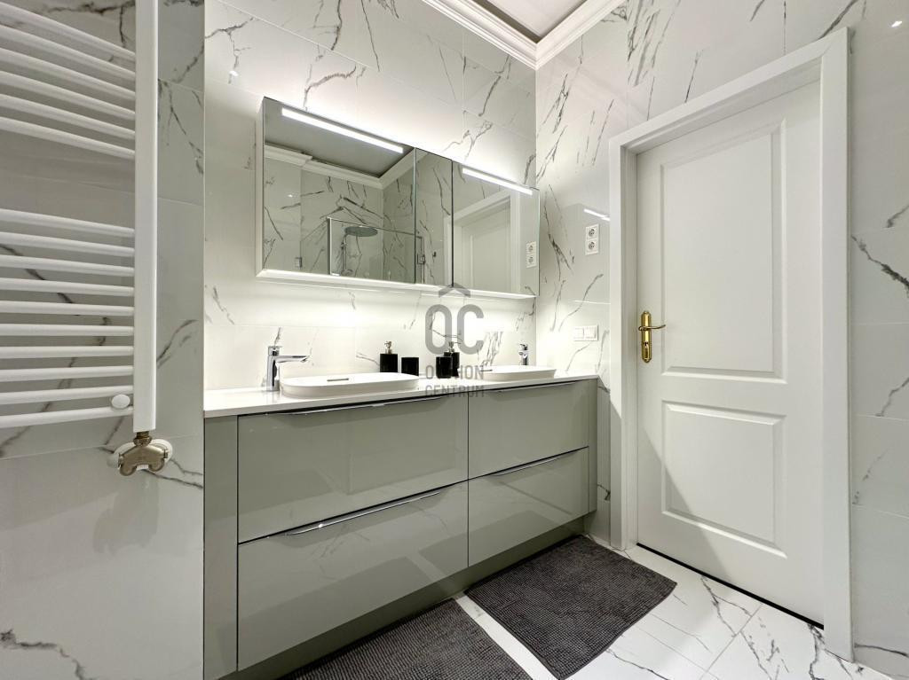 - A fürdőszoba modern márványhatású hidegburkolattal a többi helyiség elegáns és időtálló, halszálka mintában lerakott vinyl parkettával burkolt.
