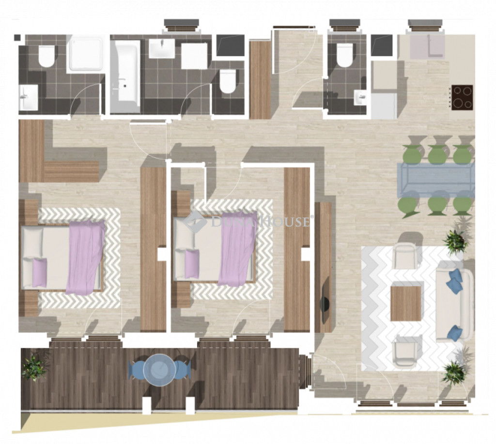Elrendezés: nappali-étkező amerikai konyhával, két különnyíló háló, két fürdő - két wc, kamra