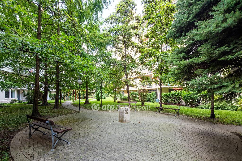A ház belső kertje valódi oázis a városban: kerti tó, padok, játszótér, csúszda, hinta és homokozó várja a lakókat.