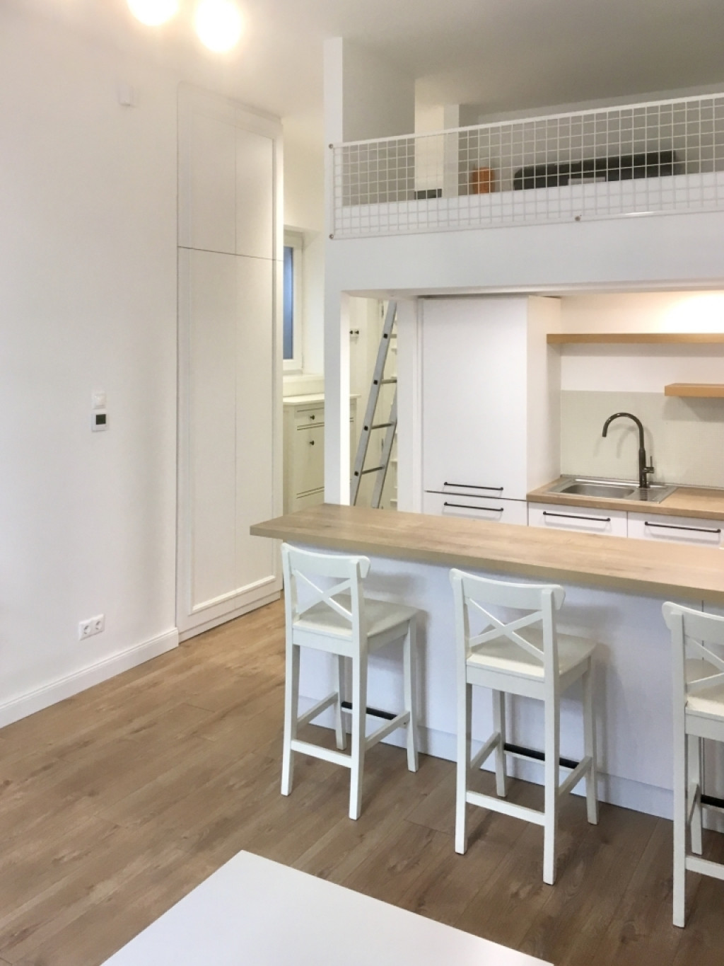 - A szoba kényelmes nappaliként funkcionálhat, mivel a konyha fölé épített fekvőgaléria praktikusan biztosítja az alvás lehetőségét.
