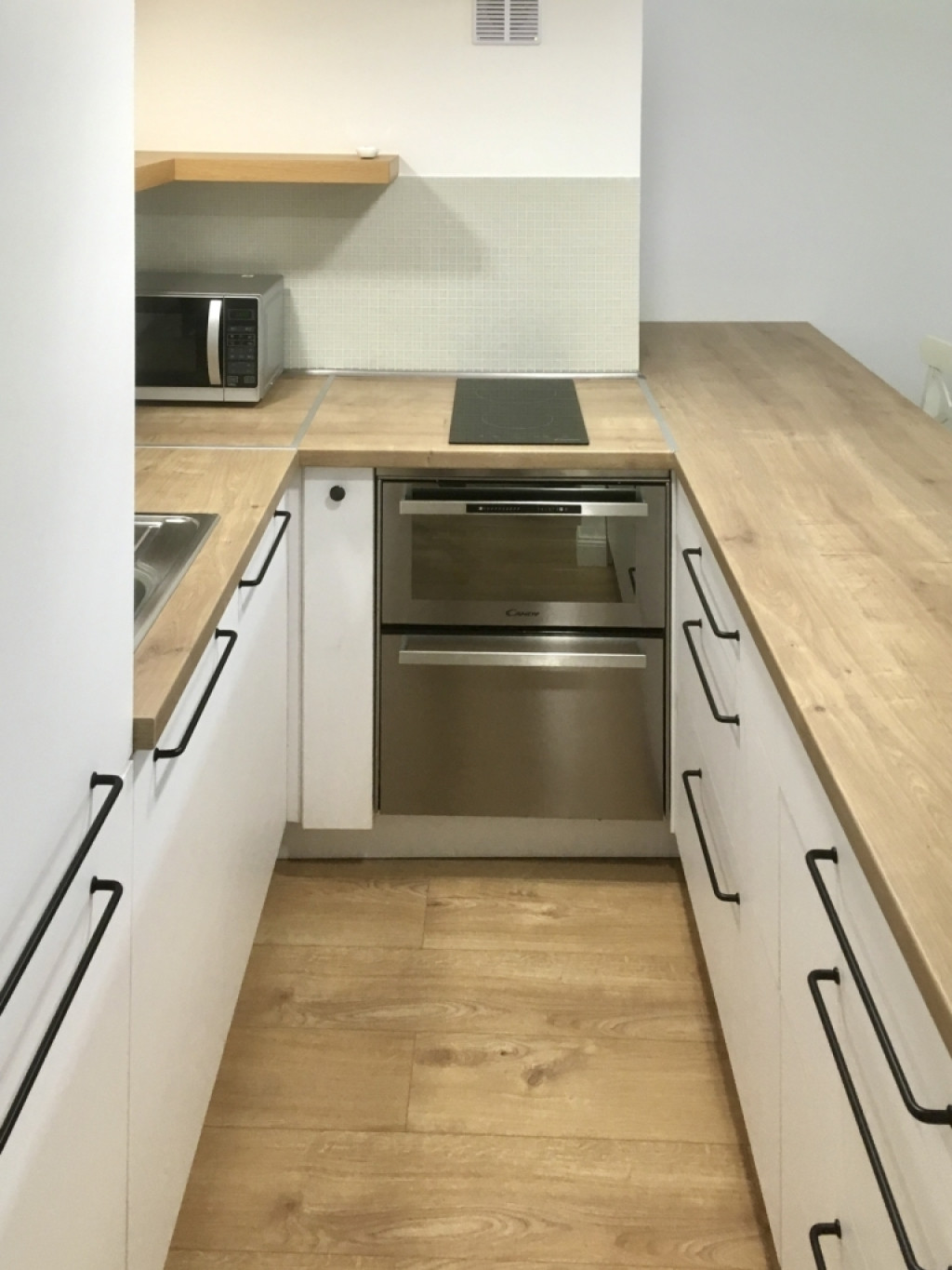- A zuhanyzós fürdőszoba stílusos hidegburkolattal a többi helyiség laminált parkettával burkolt.