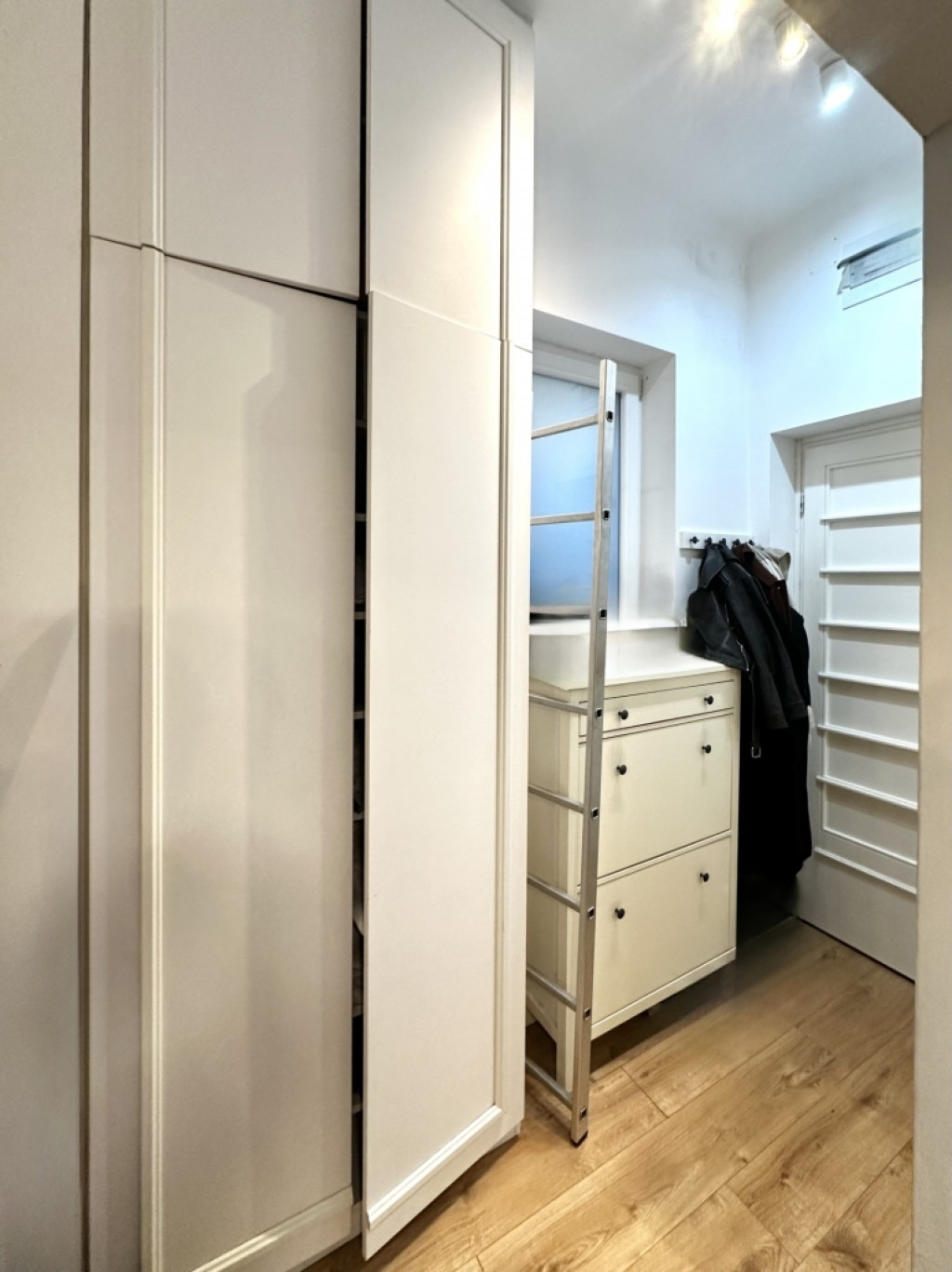 - Az előszobában és a szobában található három mennyezetig érő gardróbszekrény bőséges tárolóhelyet biztosít.
