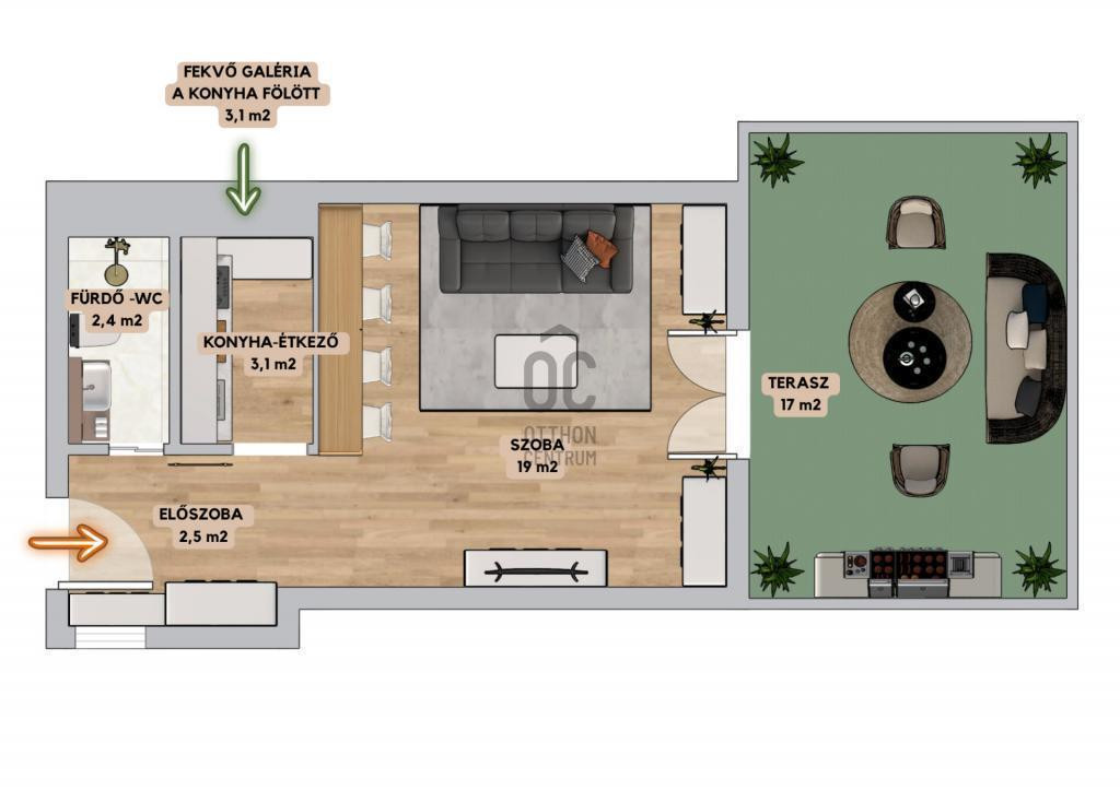 - Felosztása: előszoba, konyha-étkező, szoba, fekvő galéria, fürdőszoba toalettel, nagy méretű terasz.