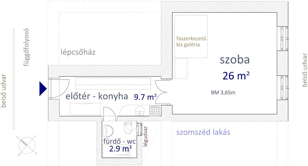 - belső udvari függőfolyosóról nyíló előszoba – konyhatér beépített tároló szekrénnyel beépített konyhabútorral, gáztűzhellyel, melegvíz boilerrel, páraelszívóval,
