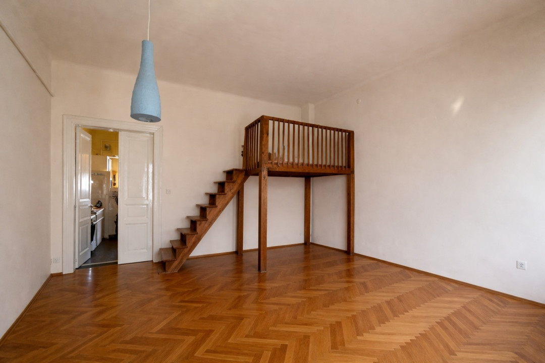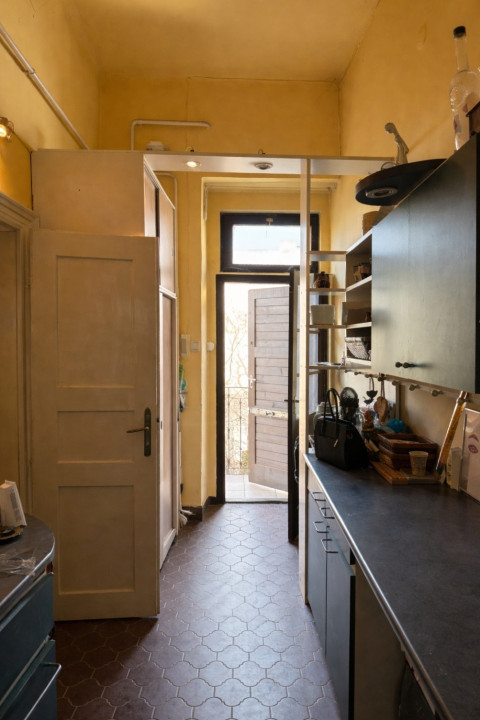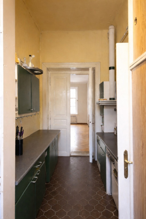 - from the entrance hall–kitchen area, a bright, spacious, sunny room (approx. 26 sqm) opens out, overlooking the green inner courtyard with a panoramic view of the surroundings. it has a southeast orientation and high ceilings (3.65 m) and currently includes a small wooden loft/gallery (2 × 1.60 m).