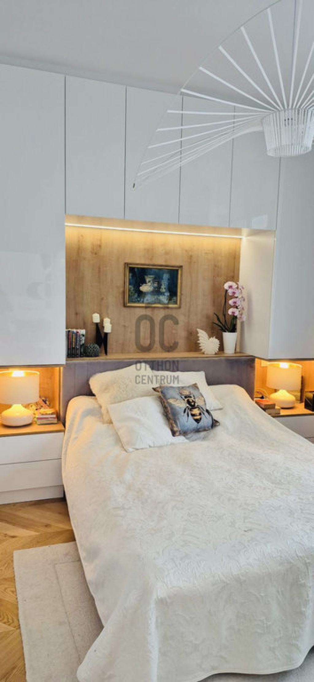 Eladó az I. kerületben, egy frissen elkészült, 78 m²-es, nappali + 2 hálószobás, 2 fürdőszobás lakás a 4. emeleten, amely nyugati fekvésének köszönhetően minden napszakban világos és meleg hangulatú.