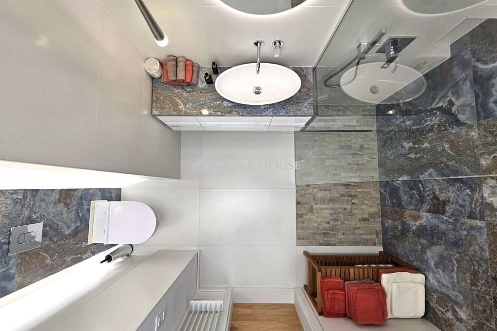 A felújítás során a lakást teljesen szétbontották: új alaprajz, új gépészet, új elektromos hálózat, új burkolatok és prémium nyílászárók kerültek beépítésre. Az eredmény egy modern, egylégterű, letisztult otthon, ahol minden részlet átgondolt. Fontosabb részletek a teljesség igénye nélkül:-VEKA 82 MD ablakok biztonsági üveggel-Motoros alumínium redőny szúnyoghálóval-Austrotherm grafitos hőszigetelés az aljzatban-Minőségi tölgy laminált padló-LG klíma-JAGA design radiátorok-Okosotthon, riasztó + komplett új elektromos rendszer-Mennyezetbe épített hangrendszer-Grohe, Viega, Tres, Roca szaniterek-Egyedi gyártású konyhabútor Siemens és Miele gépekkel-Saját tároló a ház pincéjében.