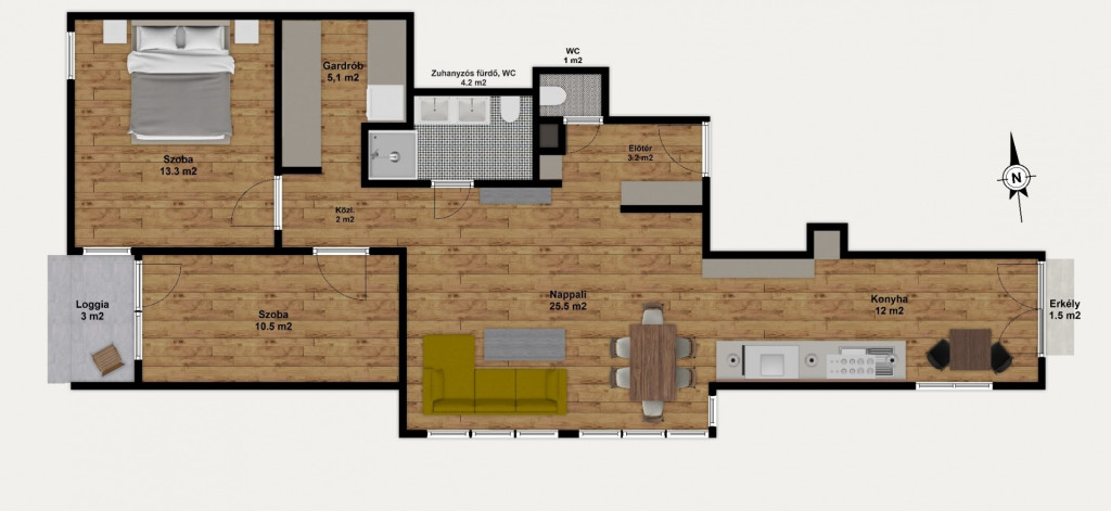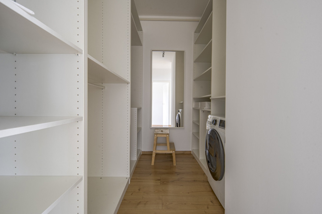 A két hálószoba mellett egy minden igényt kielégítő gardrób is kialakításra került, ide lett kivezetve a mosógép kiállása.
