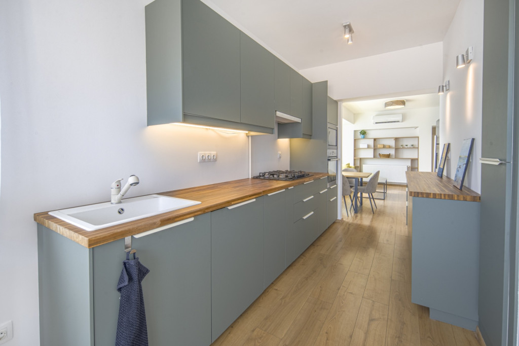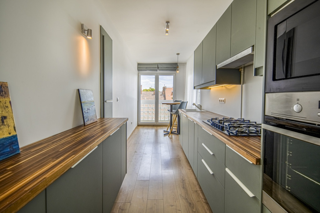 Az ingatlan felújítása mindenre kiterjedő volt: az összes vezeték, cső és nyílászáró, burkolatok, szekrények és konyha is cserélve lett, a hálószobák redőnyösek, a déli fekvésű nappaliban sötétítőfüggöny található. A konyha mosogatógéppel szerelt, a hűtőnek saját vízkiállás lett kialakítva a jégkockakészítéshez és a hidegvízhez.