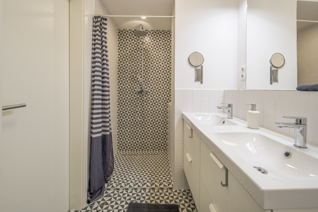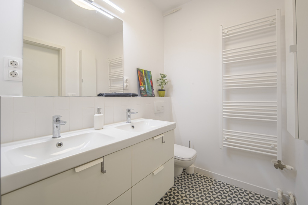 A fürdőszoba zuhanyzós, duplacsappal szerelt, valamint a külön WC mellett itt is található WC.