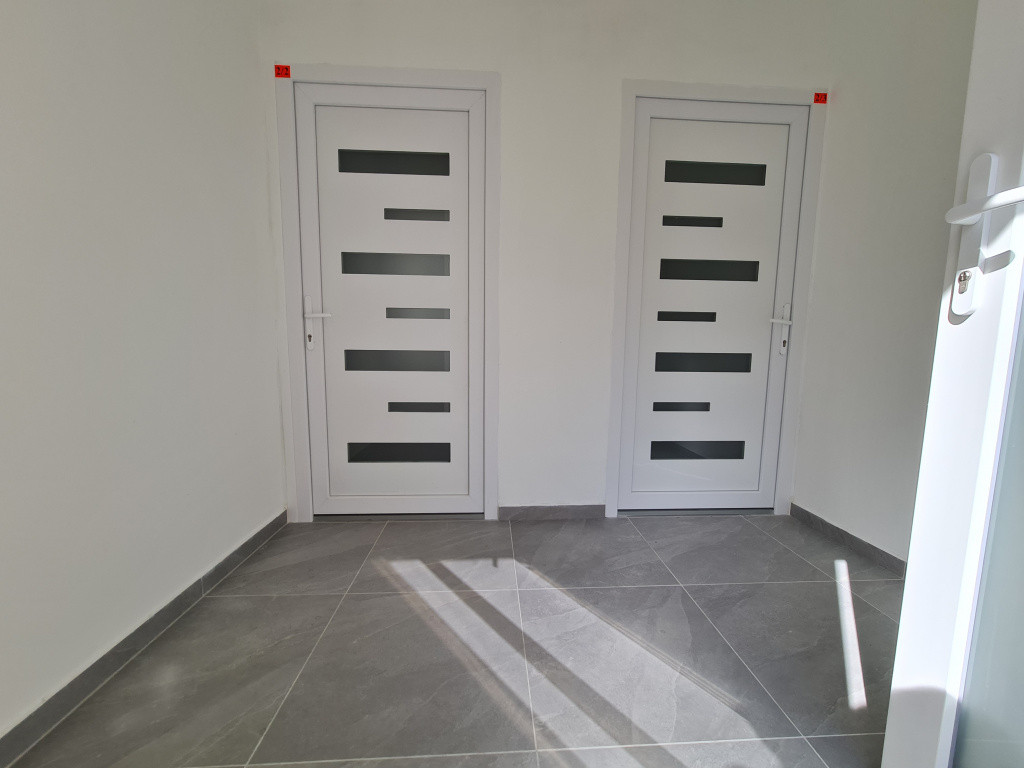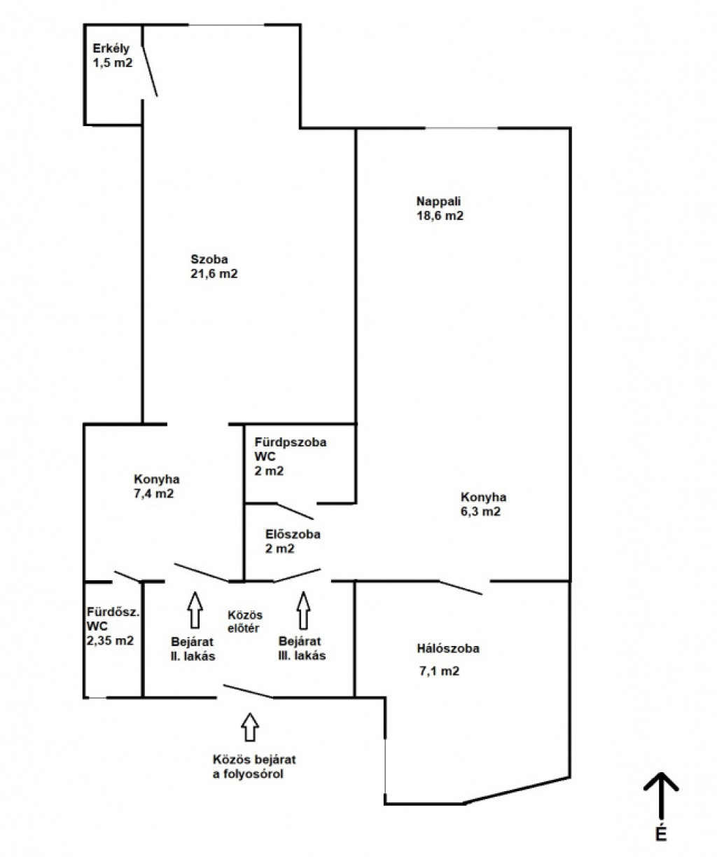 A lakás egy másik lakással közös előtérből nyílik, de az alaprajzon önálló egységként, I. lakásként szerepel. A házban egy kb. 20 m²-es közös tároló is rendelkezésre áll, amelyet három lakás használ, tökéletes sporteszközöknek, szezonális holmiknak vagy akár egy kis barkácssaroknak.