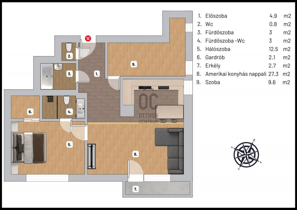 Elosztása: előtér, amerikai konyhás nappali, két szoba, gardrób, zuhanyzós fürdőszoba és WC, kádas fürdőszoba, külön WC, franciaerkély.