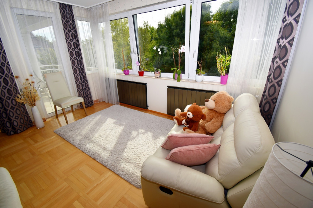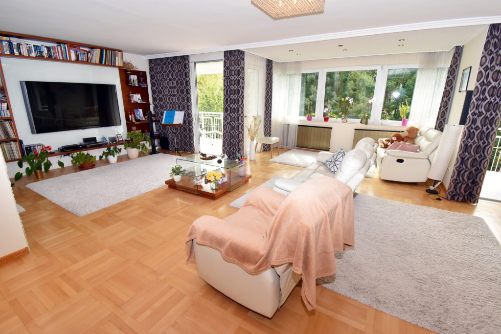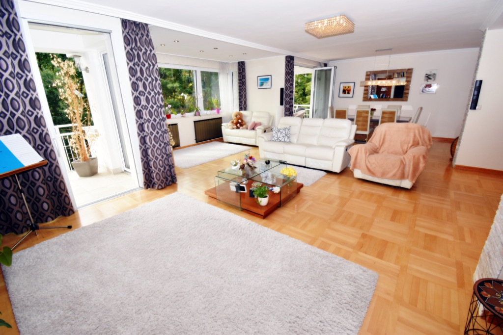 Óriási, napfényben úszó nappali, amely a családi élet központja lehet, közvetlen kapcsolattal a zöldre néző erkélyekhez.