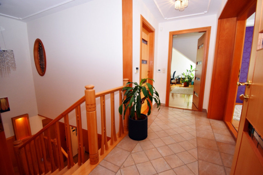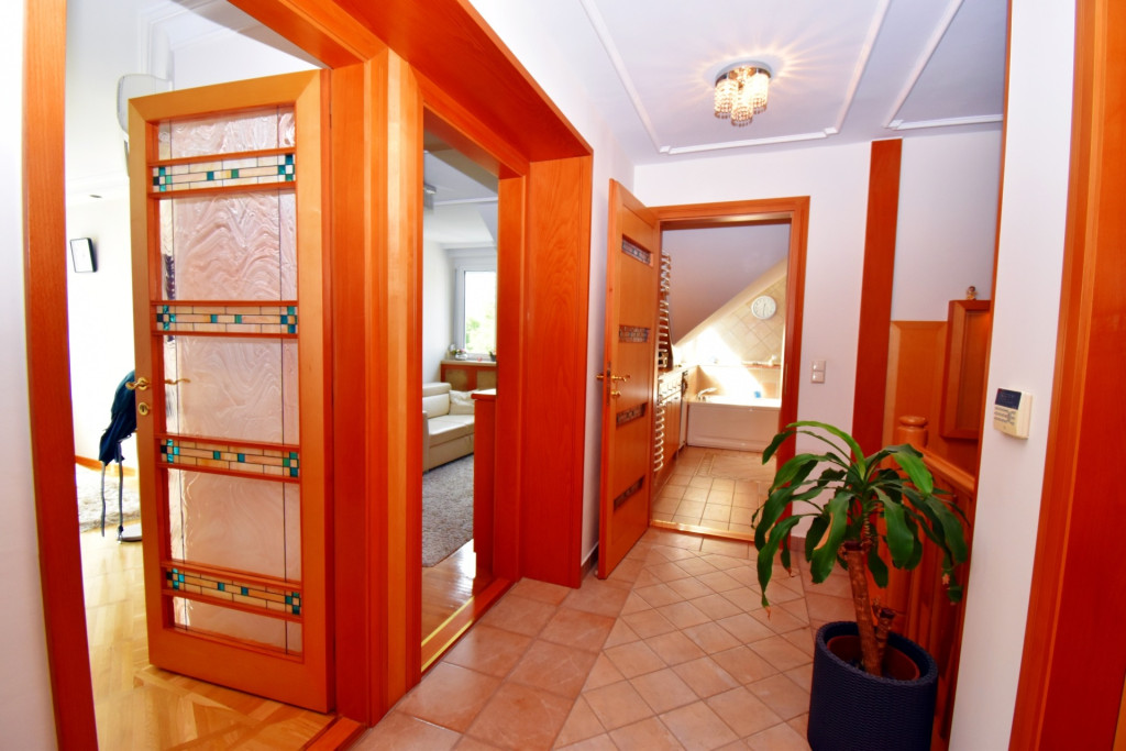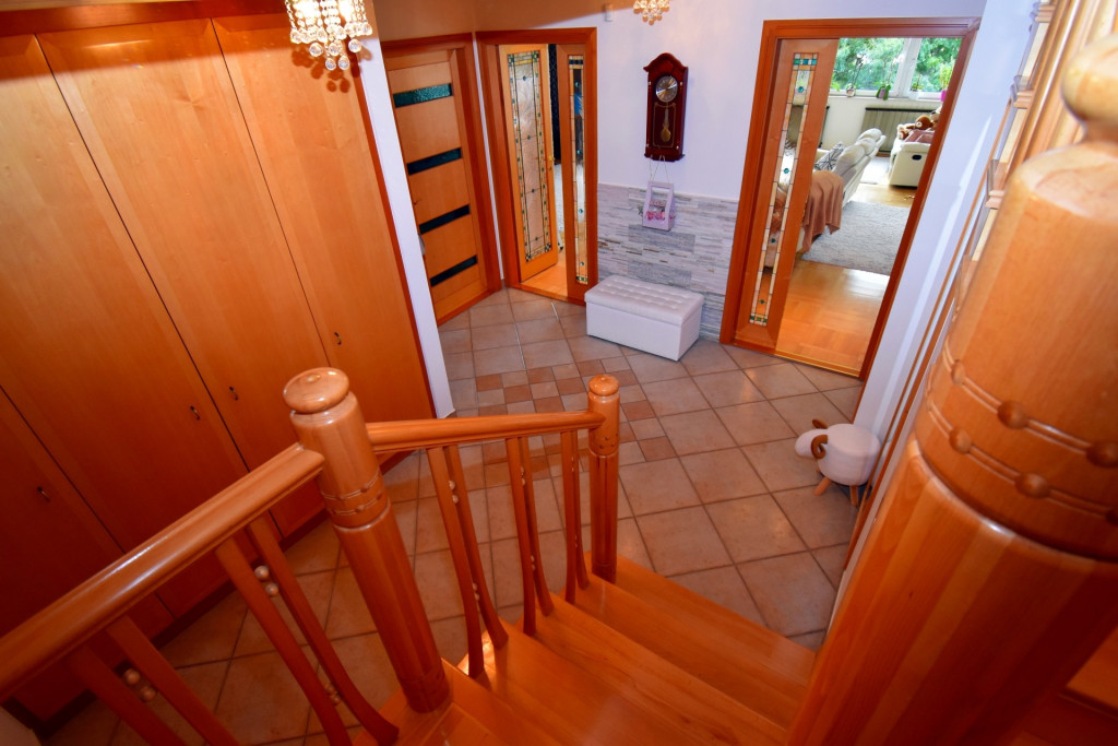 Igényes burkolatok és belsőépítészeti megoldások: tömörfa lépcső, impozáns beltéri ajtók, korszerű külső nyílászárók.