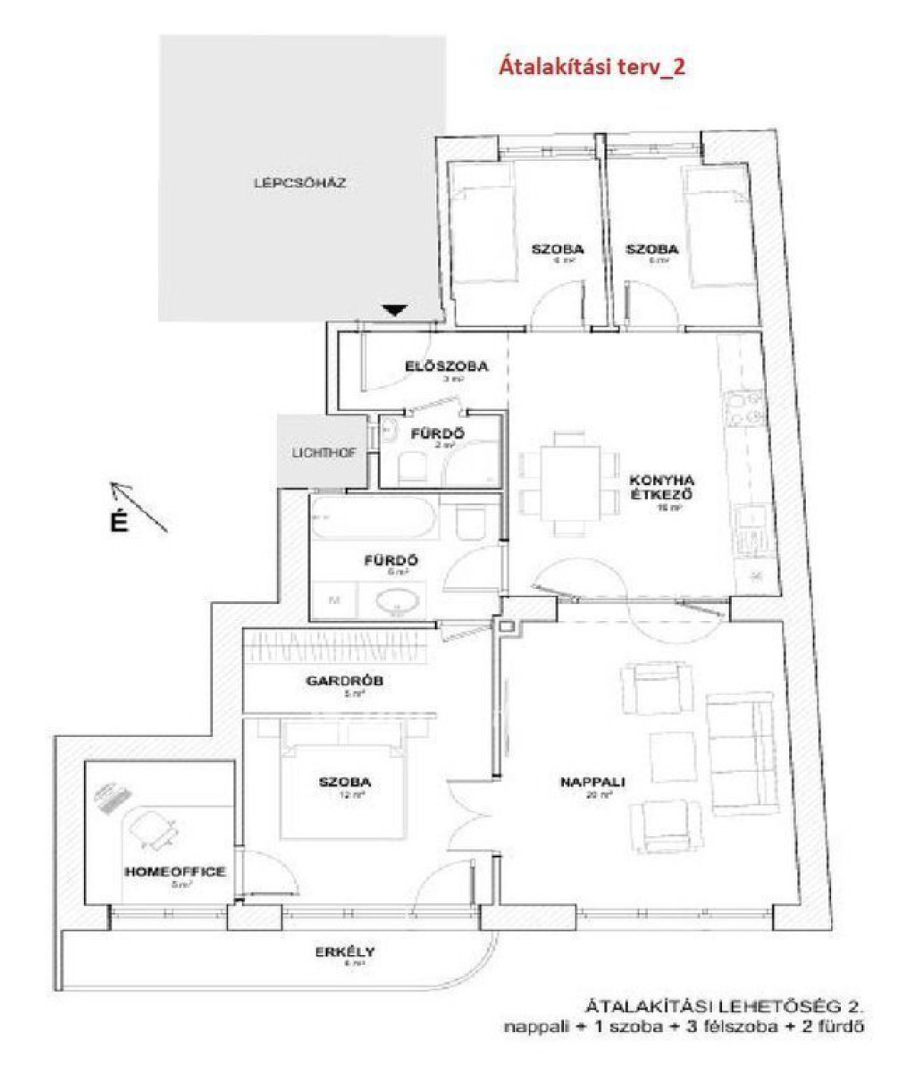 A nagy ablakoknak köszönhetően akár több fürdőszoba kialakítása is megoldható, így a lakás hosszú távon is kényelmes életteret biztosít.