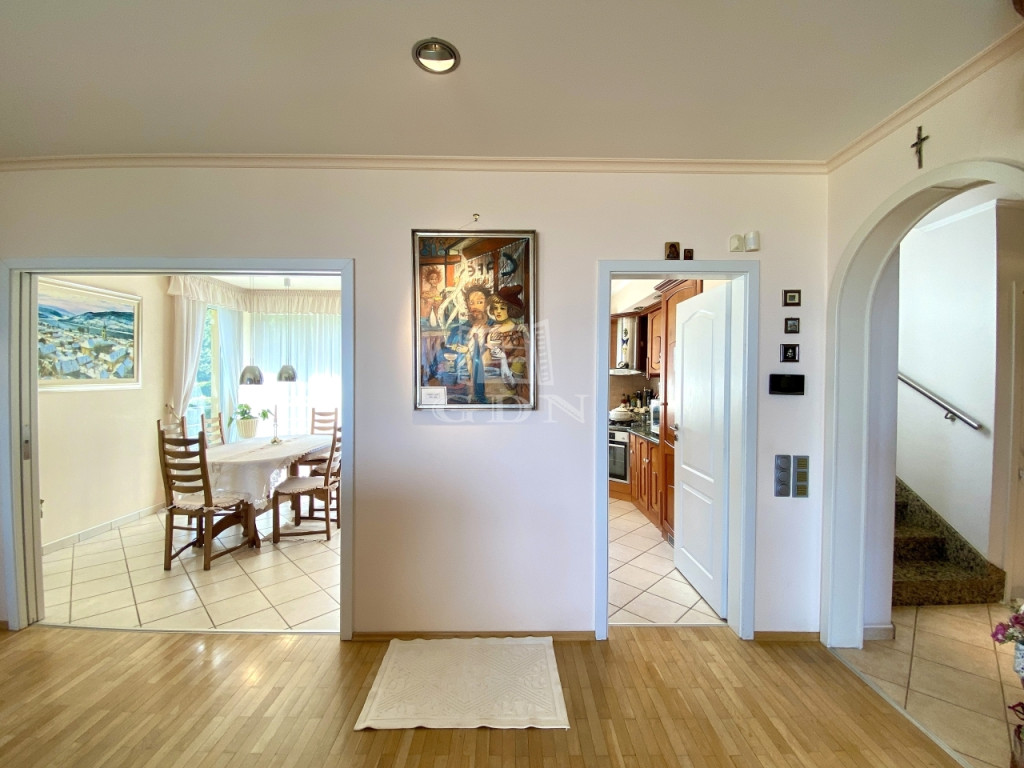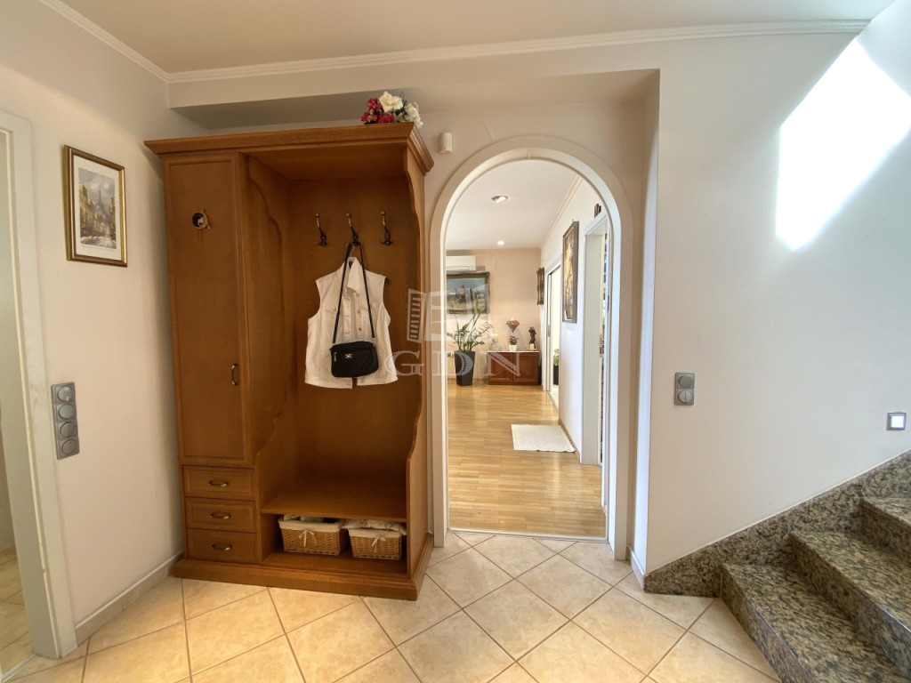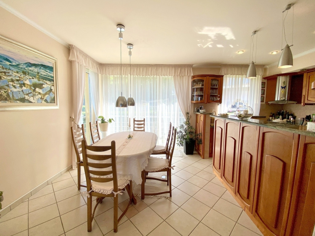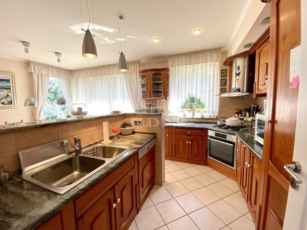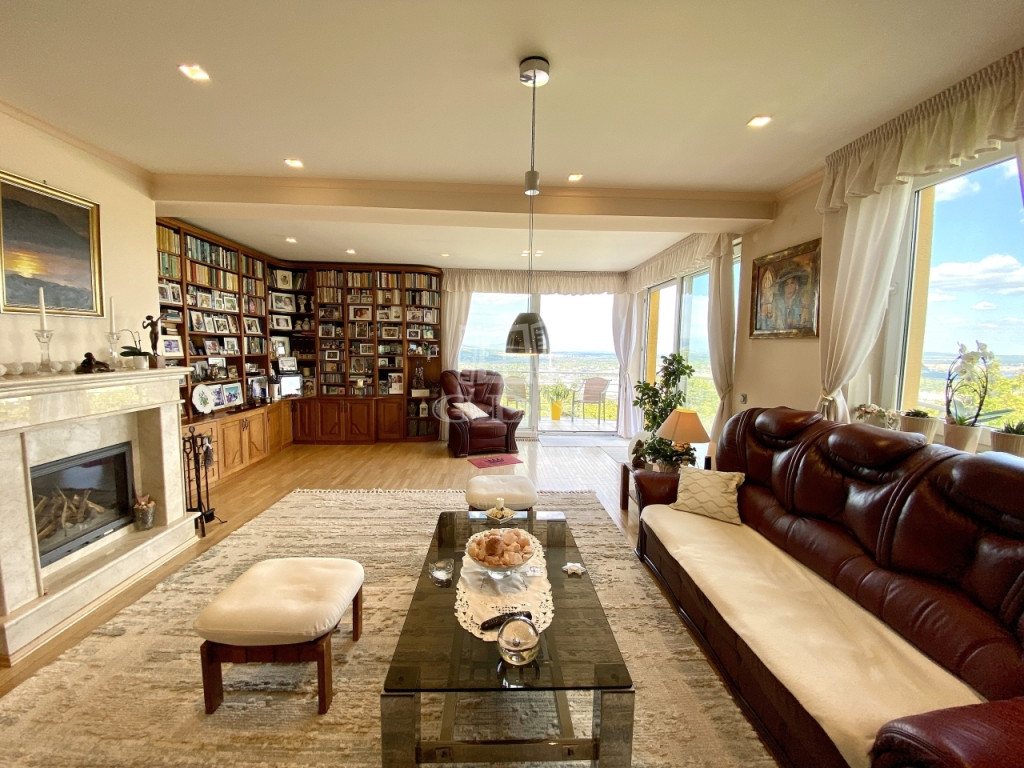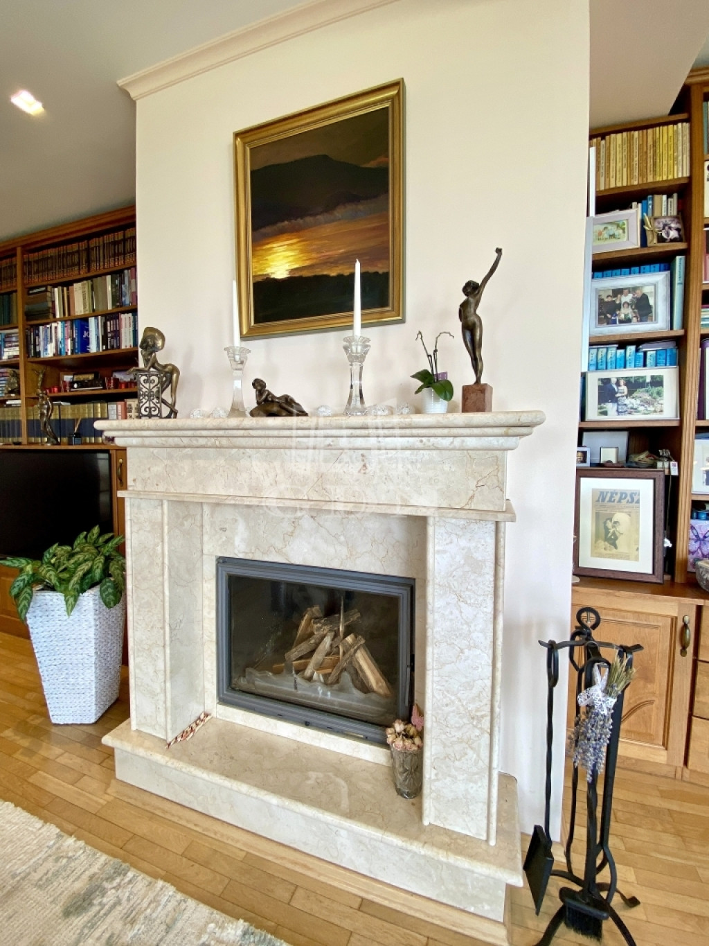 A hatalmas, 44 m2-es nappaliban egy gyönyörű márványkandalló kapott helyet, amely hűvösebb időben meghitt, kellemes hangulatot varázsol. A nappaliból egy üveg tolóajtóval elválasztott étkező és konyha nyílik. Ha akarjuk, egybenyithatjuk a két teret.