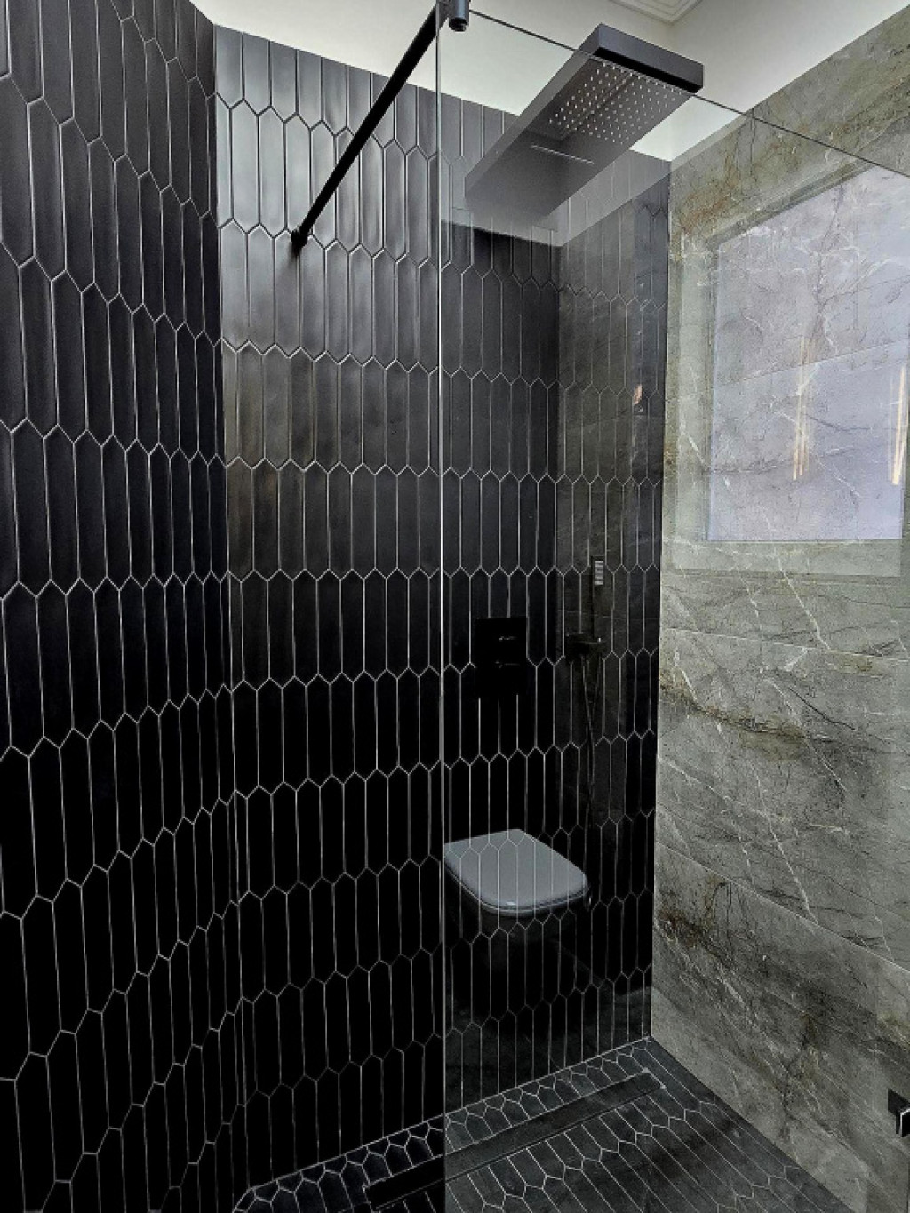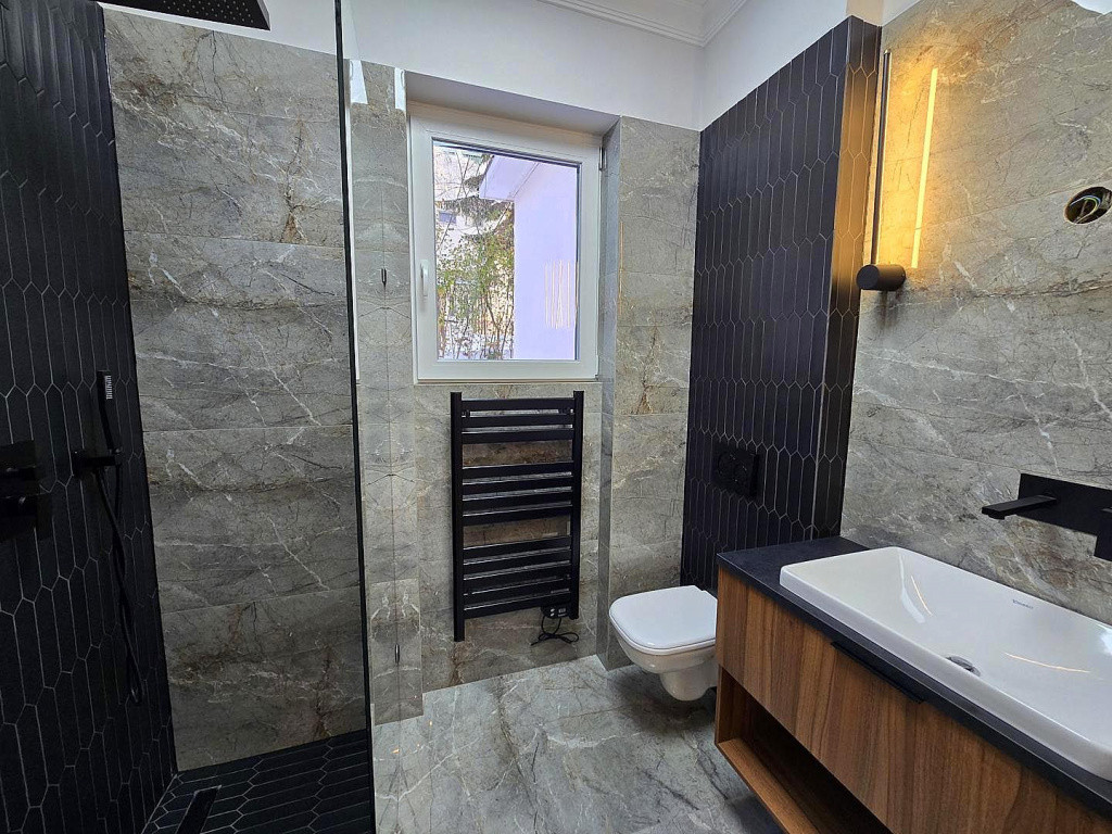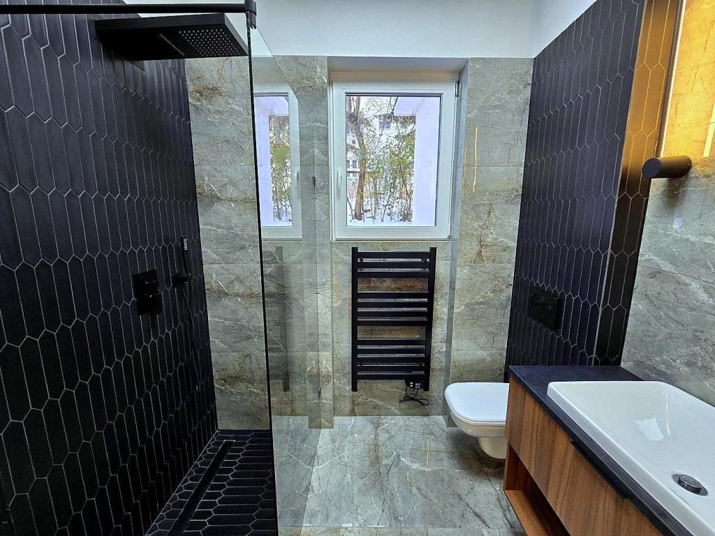 - Fürdőszoba magas minőségű felújítása spanyol burkolatokkal, egyedileg gyártott zuhanykabinnal, Duravit szaniterekkel, esőztető zuhanyzóval, Geberit wc tartállyal, patronos törölközőszárítós radiátorral