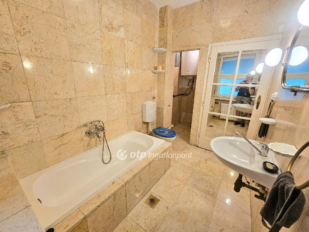 Az ablakos fürdőszoba egy nagy káddal van ellátva, innen nyílik a tehnikai helység/tároló ahova a kedvezményes tarifás távvezérelt villanyóra által ellátott elektromos vízmelegítő bojler van felszerelve. Mivel 2 külön villanyóra van így simán beleférünk a támogatott kedvezményes áram mennyiségbe. Mindkét helység a padlótól a mennyezetig szintén vastag márványlapokkal van burkolva.