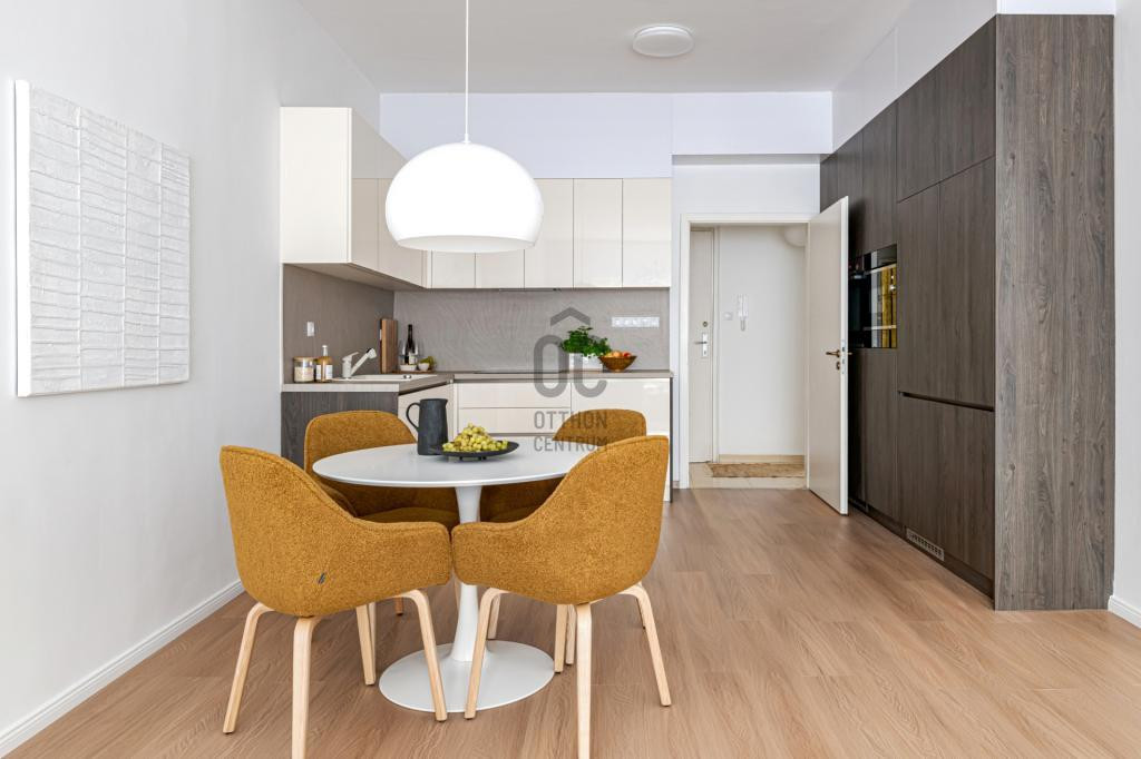 A lakás központi eleme a nagy ablakokkal megnyitott, fényes amerikai konyhás nappali, amely közvetlen kapcsolatot ad az erkély felé és a hálószobához.