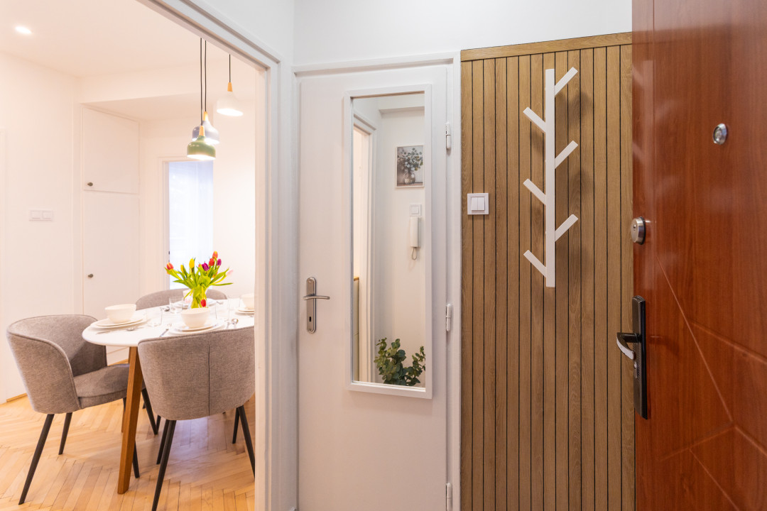 A biztonsági záras bejárati ajtón belépve egy kis előtérbe érkezünk.