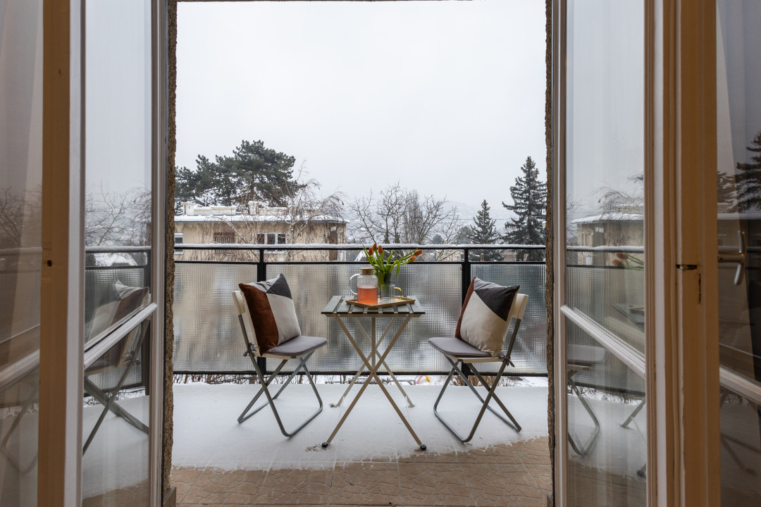 Az ebédlőből szembe pedig nyílik a lakás legnyugodtabb és legkényelmesebb tere: a világos, szép nagy nappali, ahonnan kijárás van az 5 nm-es erkélyre. Csodás hegyi panoráma van és nagyon megnyugtató a sok madárcsicsergés. A reggeli kávé mellett pedig, igen szórakoztató nézni a mókusok játékát.