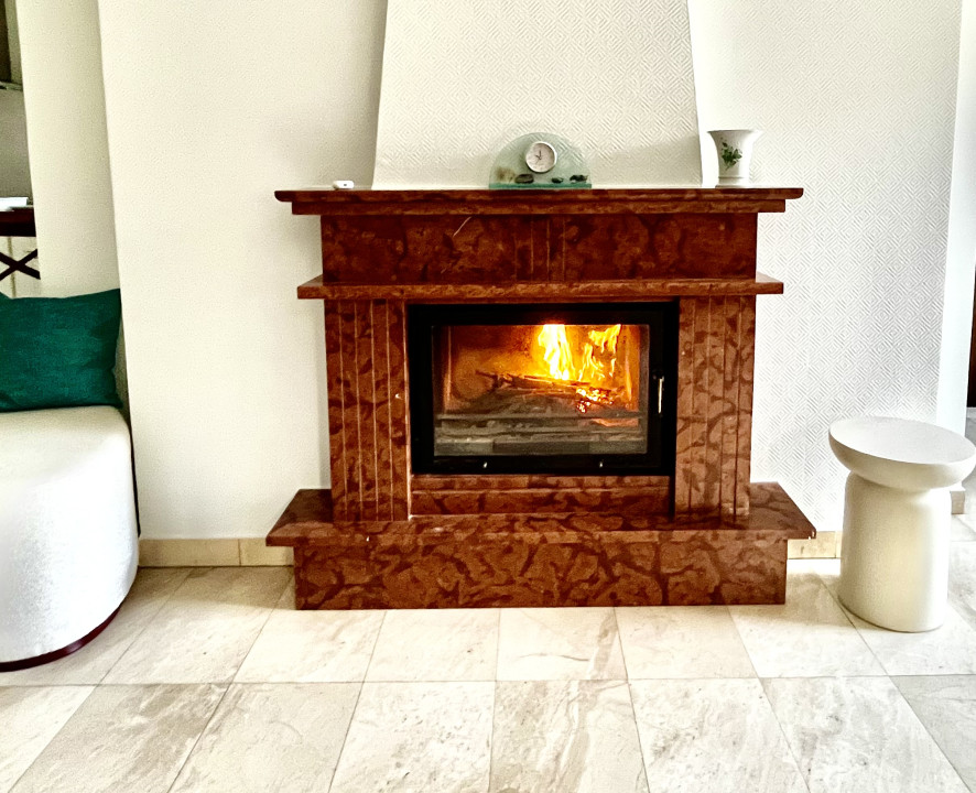 Vörös márvány kandalló, amely melegséget és kifinomultságot kölcsönöz a fő lakótérnek.