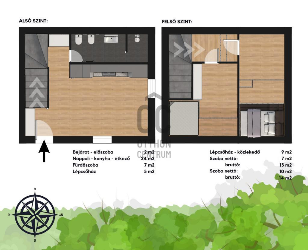 - Alsó szint felosztása: előszoba, amerikai konyhás nappali, fürdőszoba mellékhelyiséggel, lépcsőház.