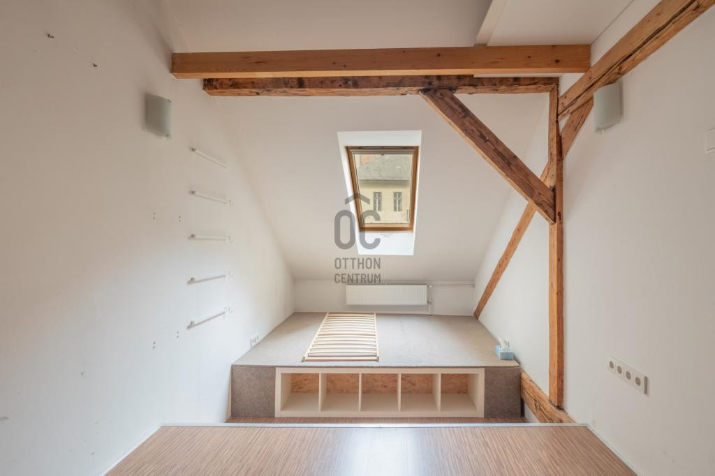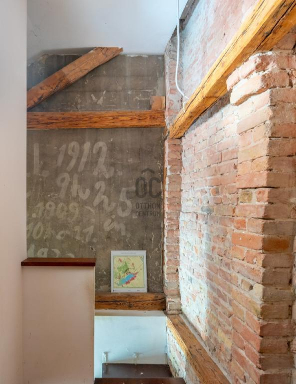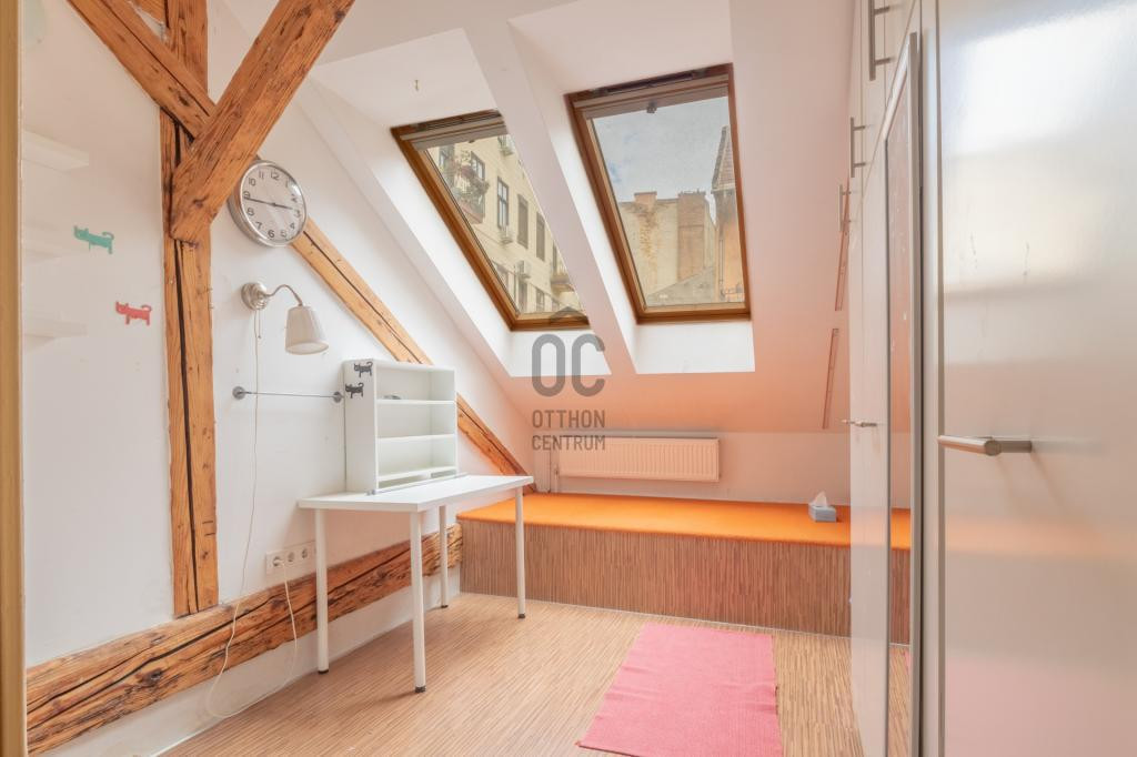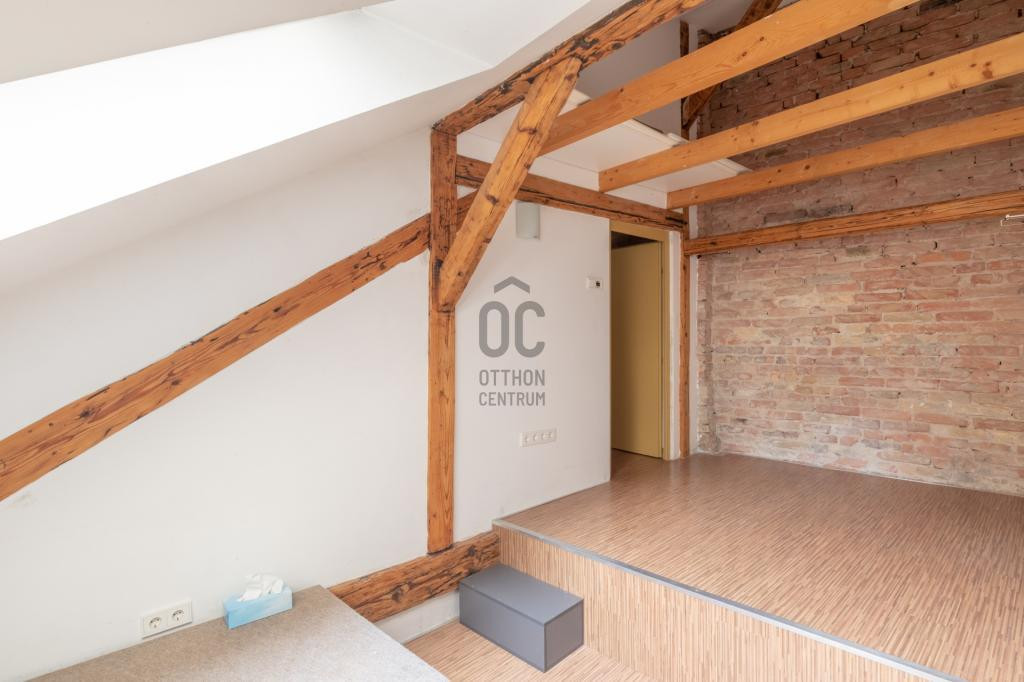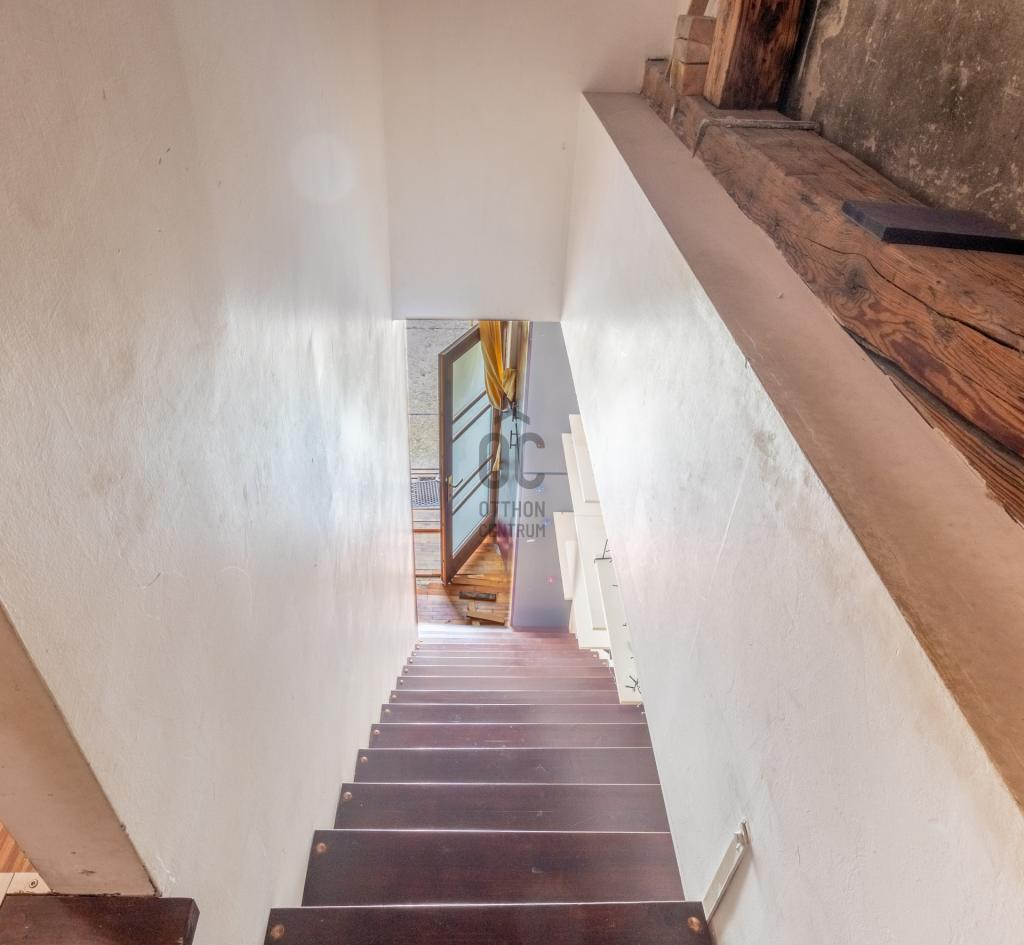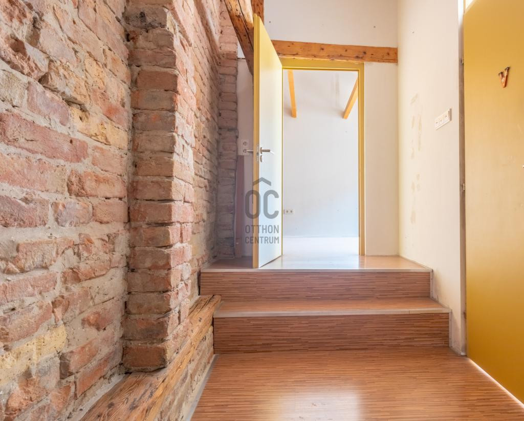 - Alsó szint belmagassága 330 cm, a beépített tetőteret látszó gerendák és vakolatlan téglafal teszi hangulatossá.