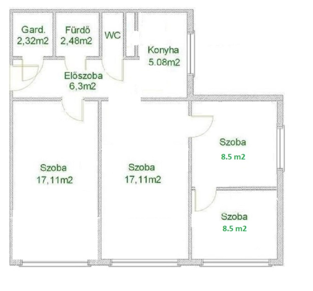 A lakásban két átalakítás történt. Eredetileg 3 szobás volt, de a szélső, dupla ablakos szobából, 2 fél szobát alakítottak ki, gipszkarton fal beépítésével, de ez igény esetén, könnyen vissza is alakítható. A másik átalakítás, hogy a középső szobának közlekedő felöli falát kivették, ezáltal egy tágas nappalit alakítottak ki.