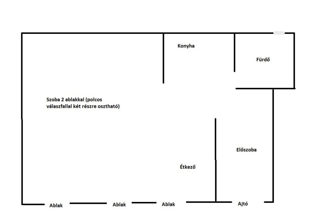 A lakás három nagy ablakkal rendelkezik, így könnyen 1+½ szobássá alakítható.