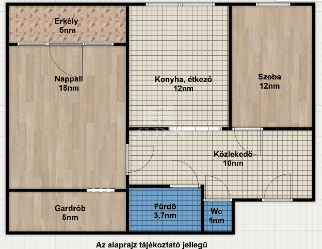 A lakótérben egy kényelmes közel 11nm-es közlekedő, az abból nyíló, 12nm-es ablakkal ellátott konyha-étkező, 3,7nm-es szellőztethető fürdőszoba, illetve külön helyiségben kialakított wc. a 18nm nagyságú erkélyes nappali és az abból nyíló 5nm gardrób helyiség, valamint a közel 12nm-es szoba került kialakításra.