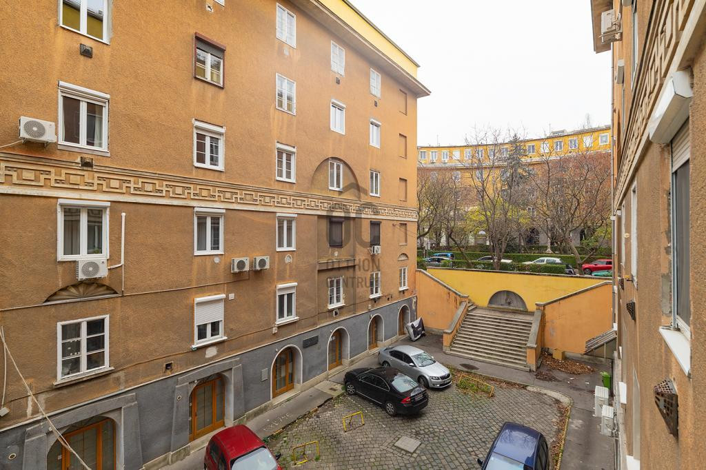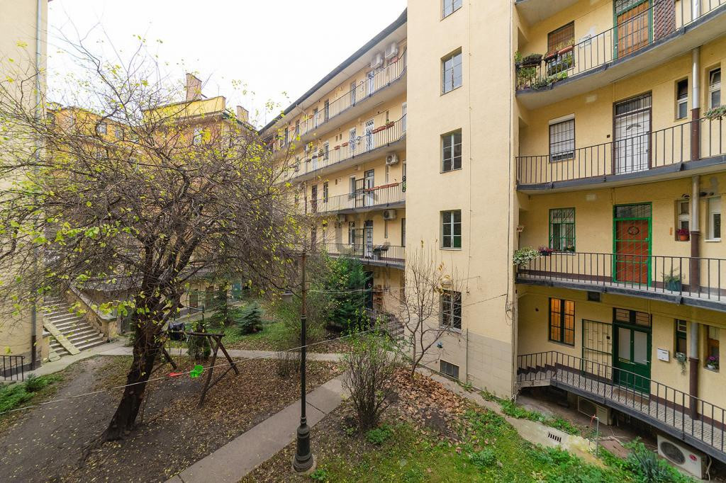 Tulajdoni lapon 2+1 szobás, a valóságban a fél szoba inkább gardrób méretű, a másik két szoba kifejezetten tágas. A lakás egy kis mellékutcára néz, ezért a kiváló közlekedés és infrastruktúra mellett kifejezetten csendes. A társasház jó állapotú, szép zöld belső udvara van, a lakóközösség kulturált. A lakás az első emeleten helyezkedik el, lift van.