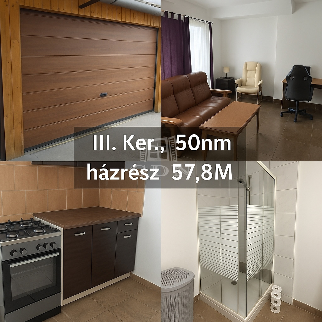 III. kerület – Békásmegyer-Ófalu • 52 m² + 23 m² garázs • előkertes • 1 háló + külön nappali • kertkapcsolatos tégla lakás • saját garázs