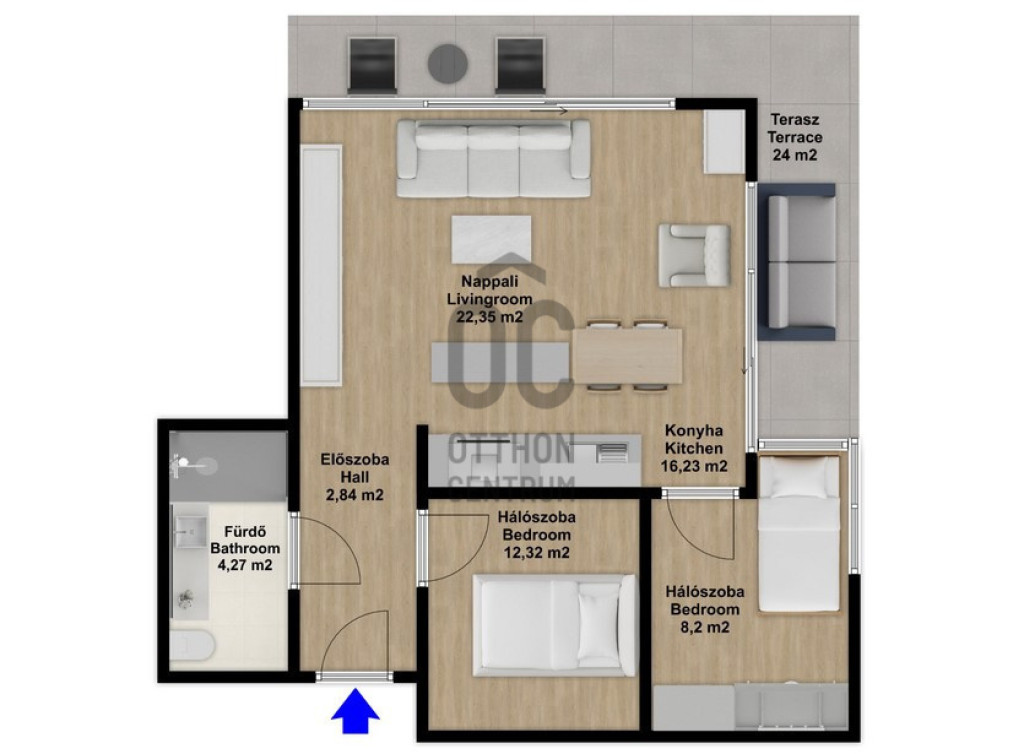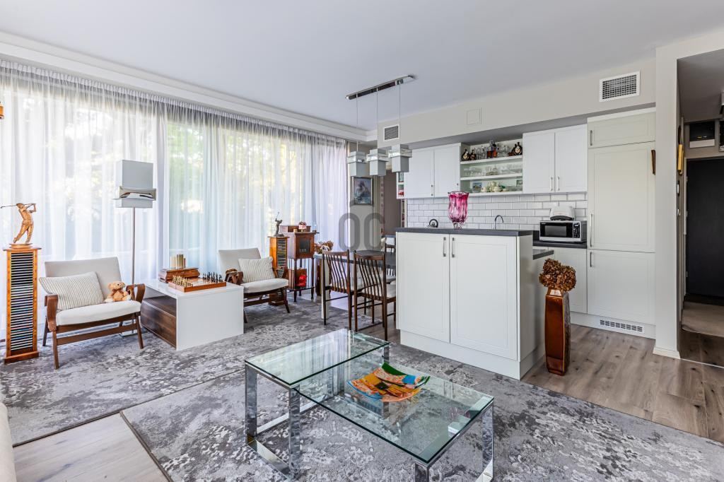A lakás egy tágas, napfényes, kertkapcsolatos amerikai konyhás nappaliból, egy hozzá szervesen kapcsolódó 24 m2-es teraszból, két hálószobából, egy zuhanyzós fürdőből és egy előszobából áll.