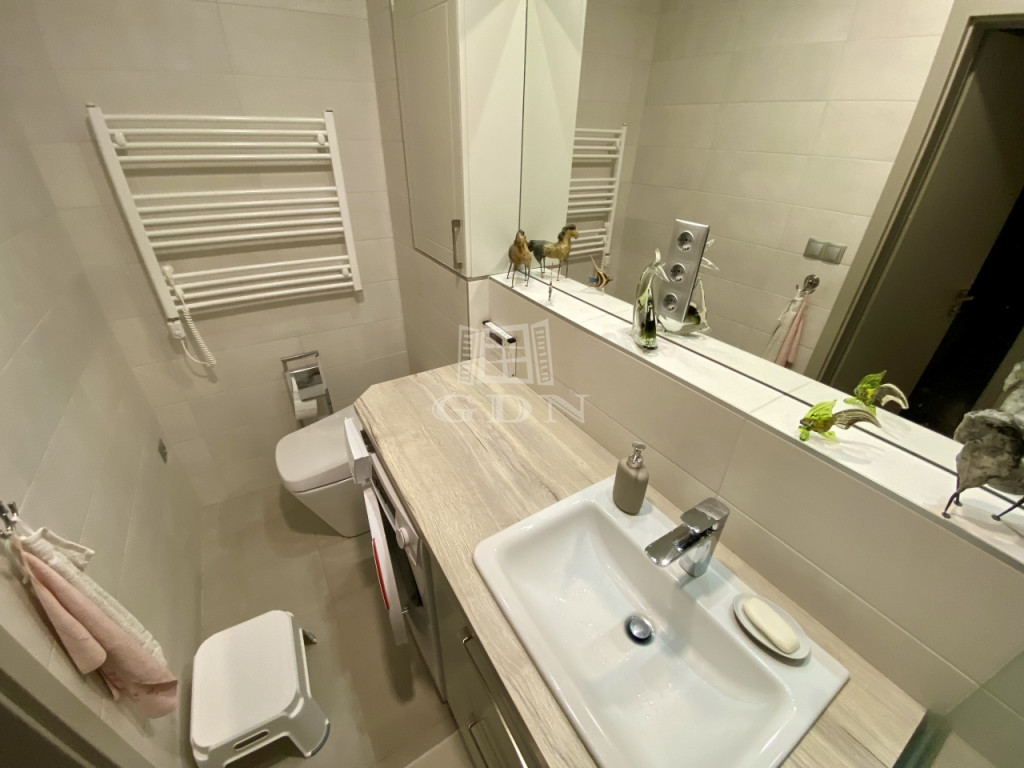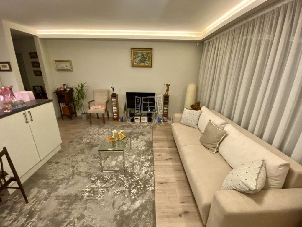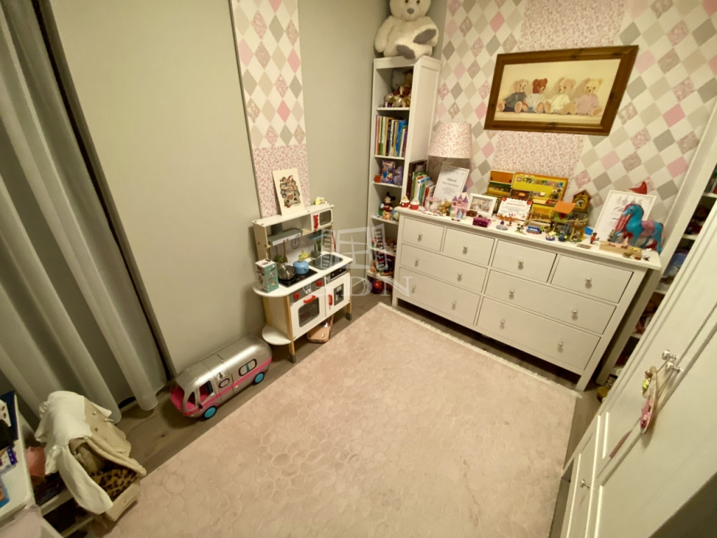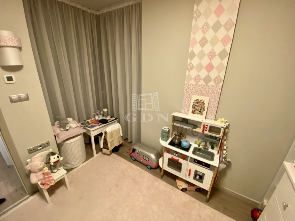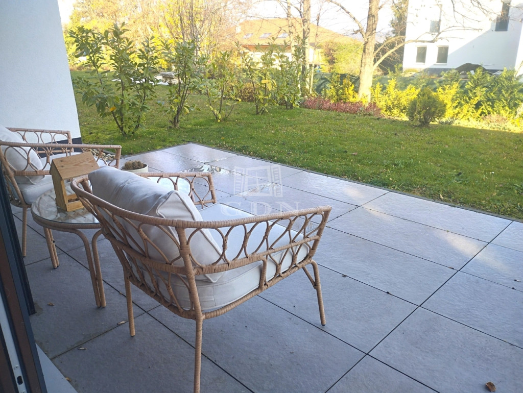 A tágas, napfényes amerikai konyhás nappali két hálószobával, egy igényes zuhanyzós fürdővel, előszobával, valamint egy 24 m²-es terasszal egészül ki, amely közvetlenül a 293 m²-es, kizárólagos használatú, öntözőrendszerrel ellátott díszkertbe nyílik.