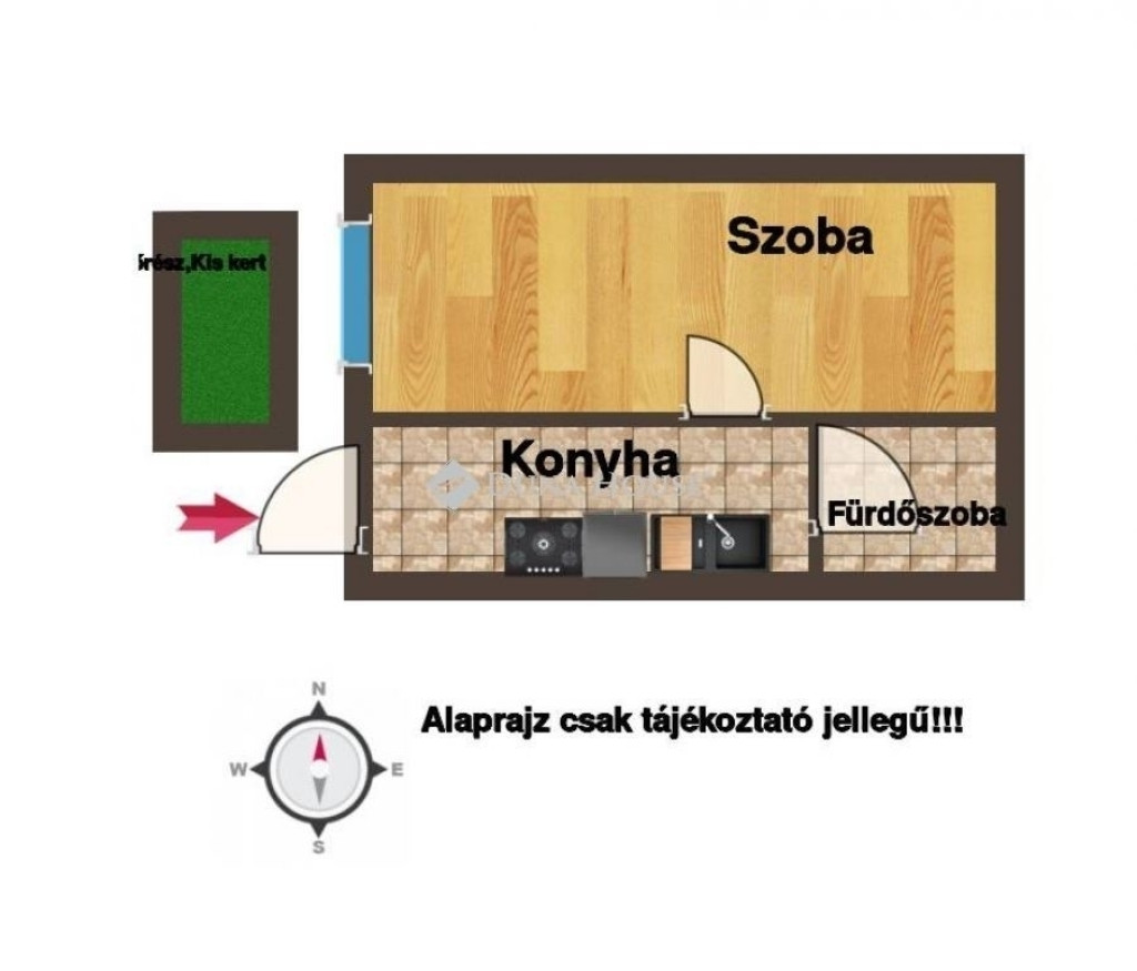 A gyorsan költözhető ingatlan DNY-ra tájolt, saját kis kertjére néz.