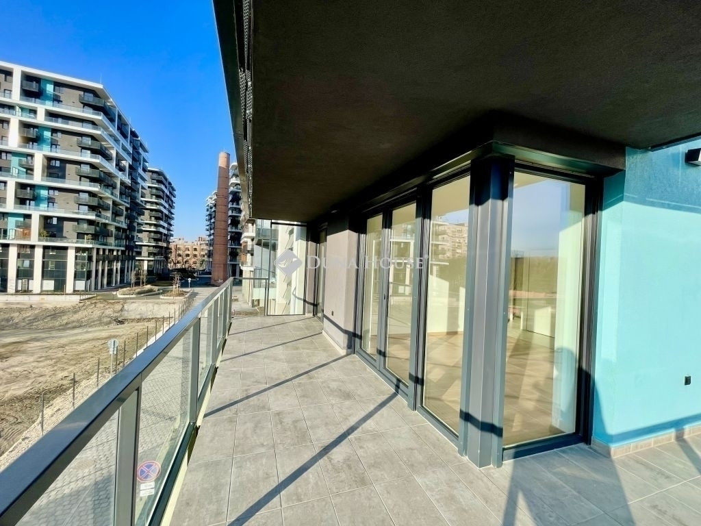 A Waterfront City - 4.ütemében, 2025-ben átadott 6b épület 2. emeletén, 43 m² br alapterületű, különleges a Dunára félpanorámával, zöld kilátással és 26 m²- es hatalmas félkörerkéllyel rendelkező saroklakást kínálunk megvételre.