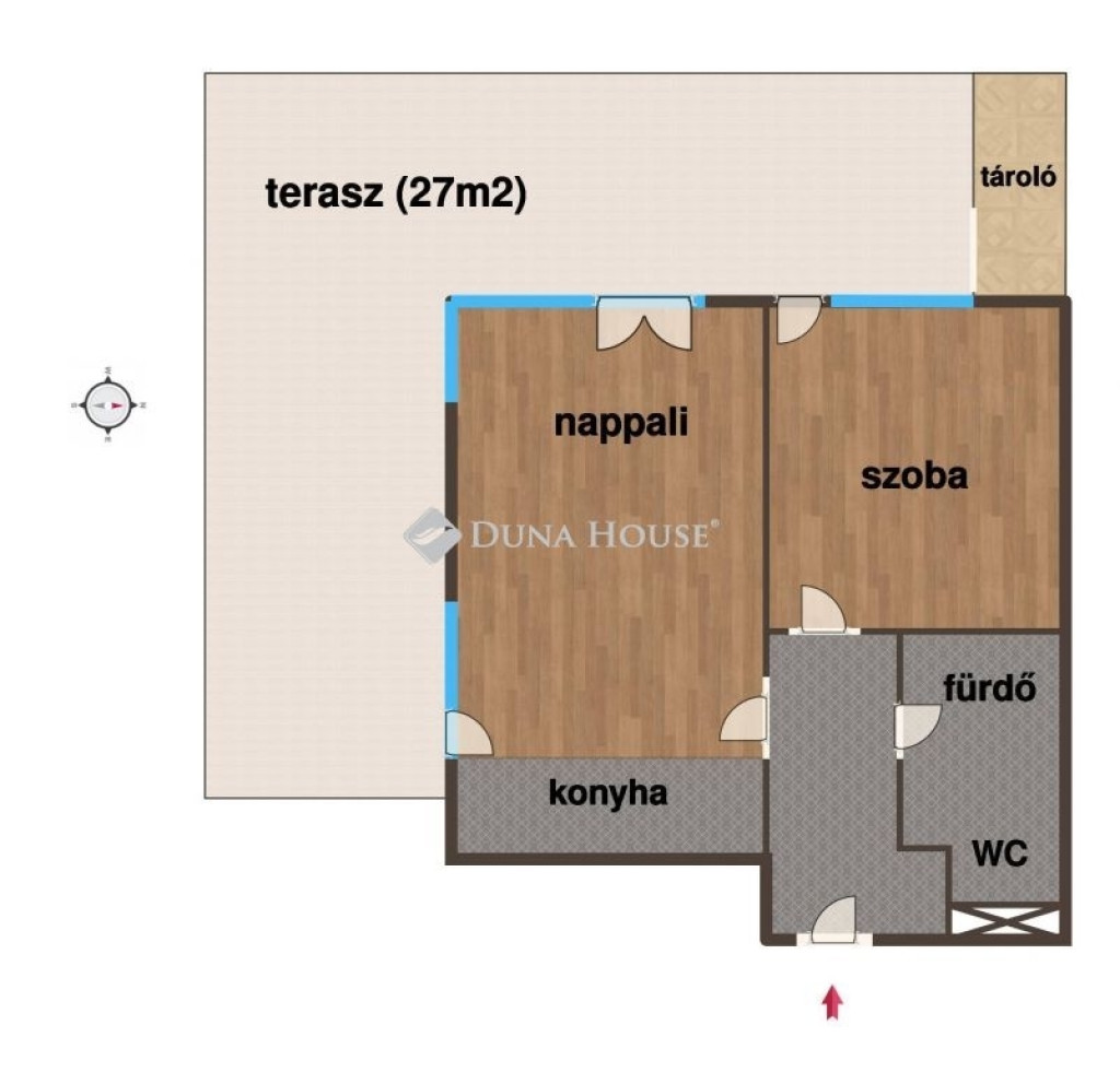 42 m² nettó alapterület, amihez csatlakozik egy 27 nm-es sarok terasz, ami mindkét szobából megközelíthető, és az egyik oldalán kialakításra került egy saját tároló is.