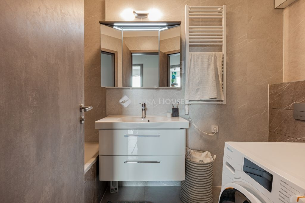 Praktikus élhető elosztása van: amerikai konyhás nappali, teljesen gépesítve (mosogatógép, sütő/mikró, kerámialap, hűtő, páraelszívó), külön hálószoba, fürdőszoba káddal, mosógéppel, törölközőszárítós radiátorral.