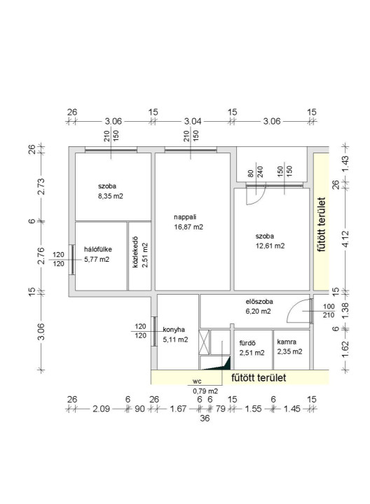 A lakás praktikus elrendezésű: 2 szoba + 2 félszoba (az egyik szoba leválasztásával kialakítva), külön konyha, fürdőszoba és WC.