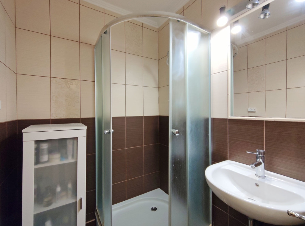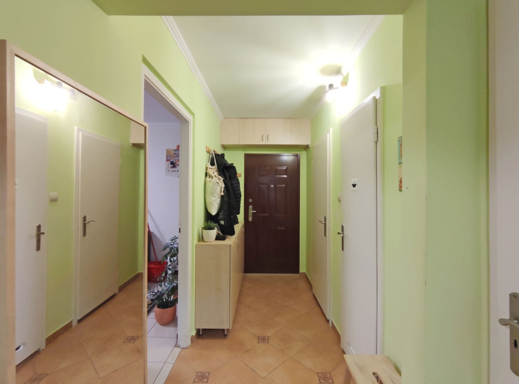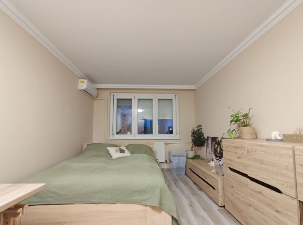 A több ponton záródó jó minőségű biztonsági bejárati ajtón keresztül a teljesen felújított és szépen karbantartott állapotú, a külön nyíló szobák elrendezését tekintve jó elosztású, délkeleti tájolású klimatizált lakásba érkezünk. A bejárattól szemben a közlekedő végében találjuk a konyhát a kamrával, bal oldalon a vizes helyiségek, a bejárati ajtó mellett balra a gardrób, jobb oldalon pedig a szobák nyílnak meg. A kerámia burkolatú előszobában közvetlenül jobb kéz felől járólap burkolatú, tágas, világos, parkra néző, 18 nm-es, műanyag ablakos, redőnyös, új, minőségi LG márkájú klímával szerelt nappaliba jutunk. A közlekedőben közvetlenül a nappali mellett jobbra nyílik a másik, szintén 18 nm-es, minőségi parketta burkolatú hálószoba. A szobából kilépve a közlekedő végében juthatunk a járólapos, lihthofos (világítóablak) szúnyoghálós ablakos, gépesített, 4 gázlángos és elektromos, légkeveréses sűtős tűzhellyel felszerelt, mosogatóval is beépített konyhába. A konyhából visszafelé haladva, jobbra találjuk a külön nyíló, járólappal és csempével burkolt, 2,4 nm-es fürdőszobát, mellette pedig a szintén minden elemében felújított, járólapos toalettet.
