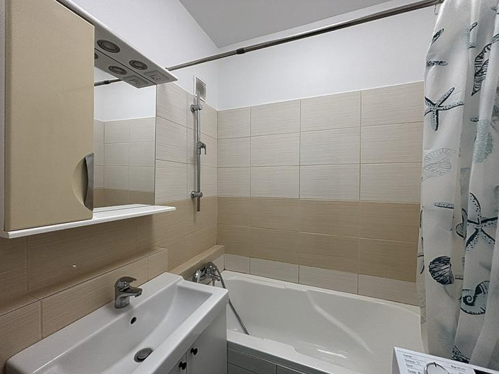 A fürdőszoba szintén teljesen megújult: új akrilkád és új burkolatok kerültek be, letisztult, időtálló stílusban.