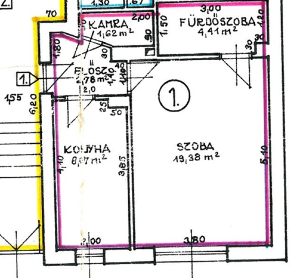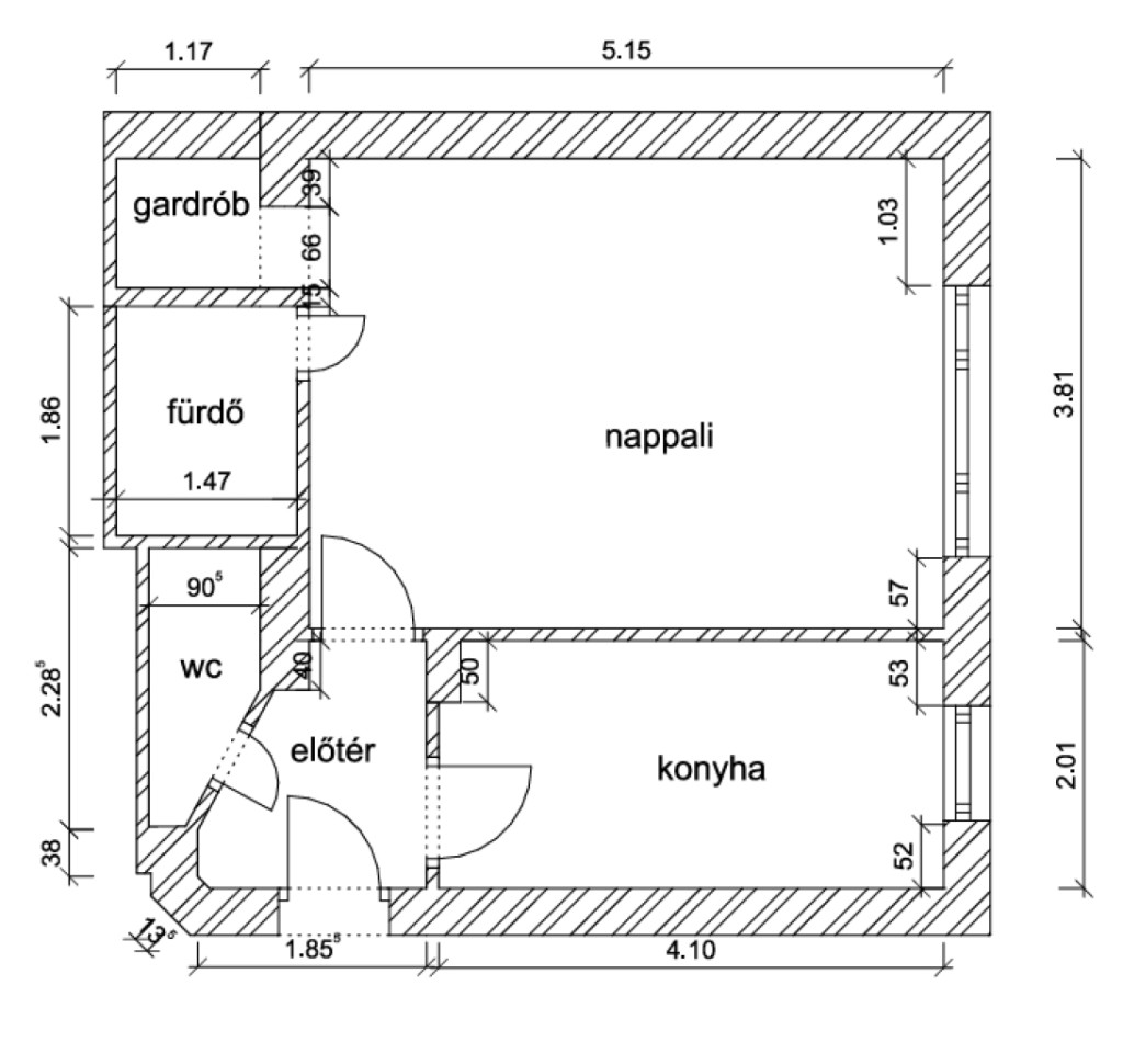 Praktikus elrendezés – minden helyiség külön bejáratú: előszoba, konyha, fürdő, külön WC, gardrób és egy tágas szoba.