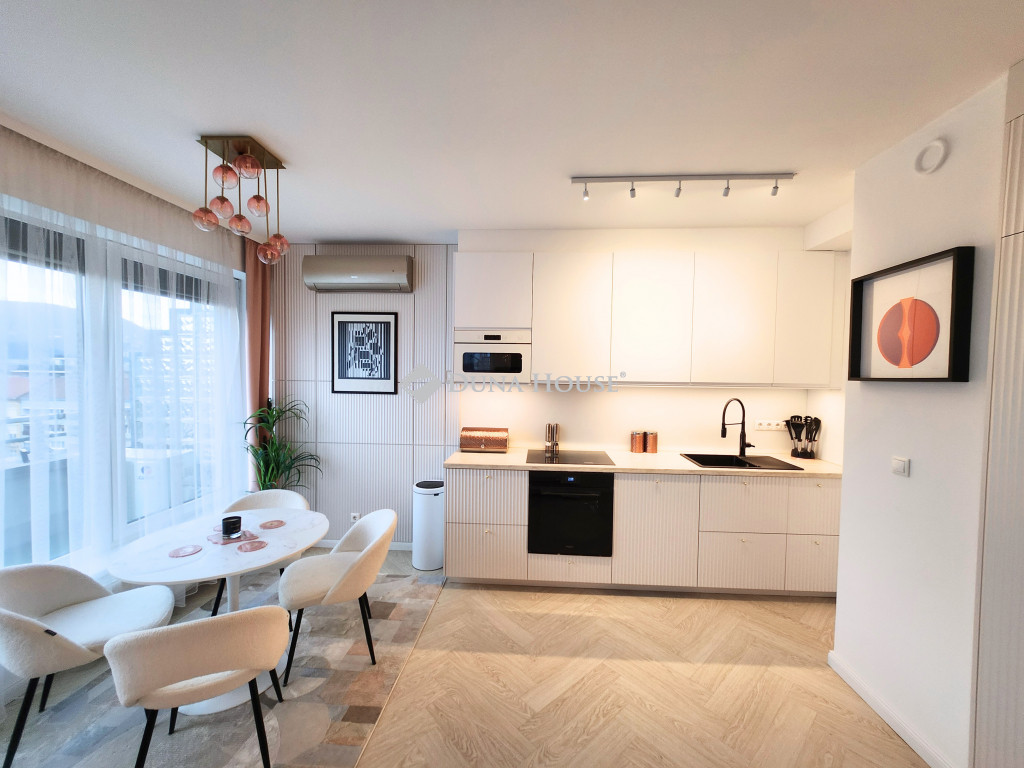 A praktikus elrendezés része két jól szeparált hálószoba, valamint egy tágas, amerikai konyhás nappali. A két fürdőszoba közül az egyik közvetlenül kapcsolódik a master bedroomhoz, megteremtve a kényelmes, prémium otthoni élményt. A lakás továbbá egy külön gardróbhelyiséget is kínál, amely még rendezettebb és kényelmesebb mindennapokat biztosít.