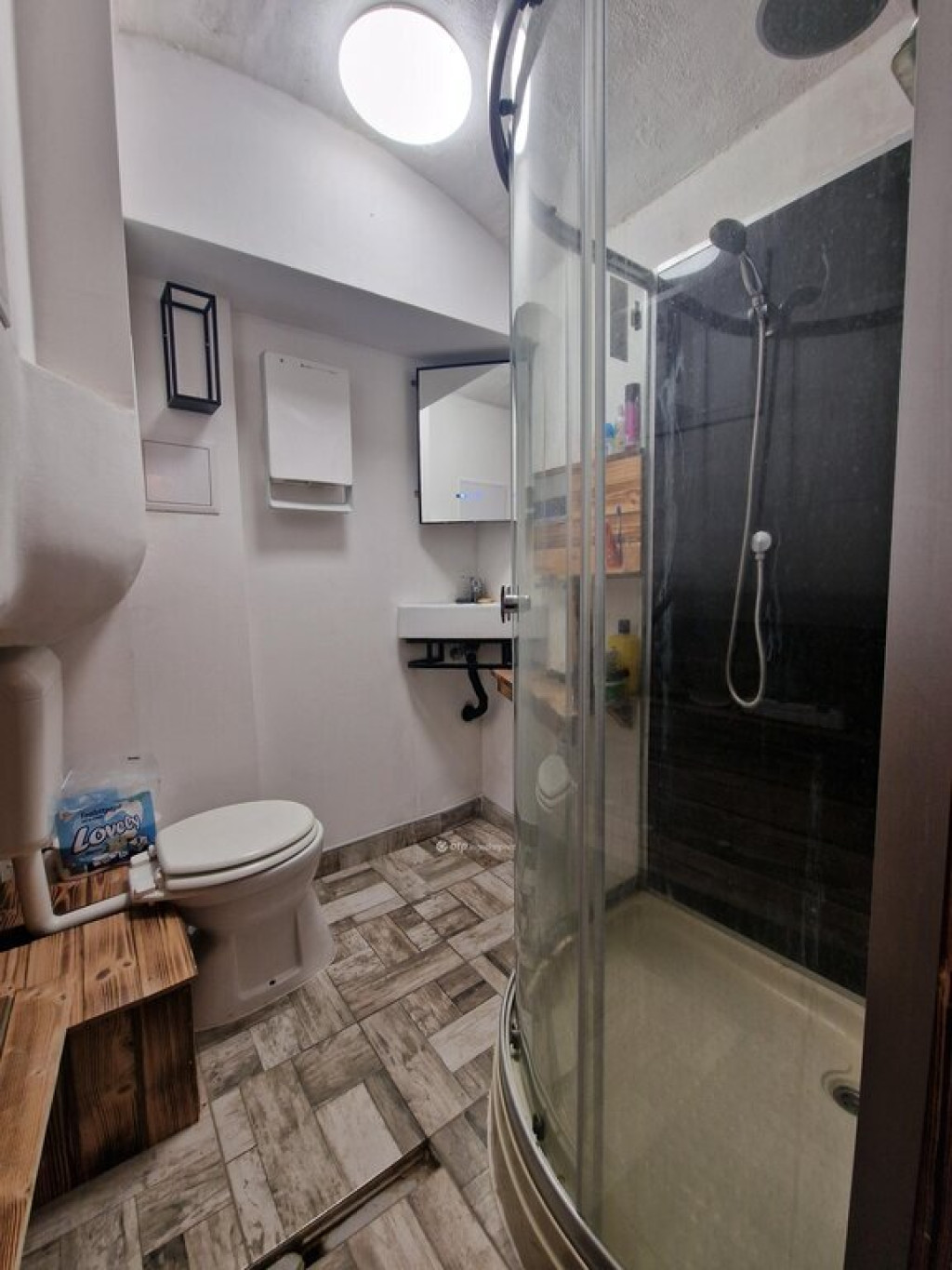 A nappali részből továbbhaladva 2 pici helyiség következik, balra találunk egy zuhanyzós fürdőszobát WC-vel, ami darálós kialakítású, de megbízhatóan működik. Balra egy pici konyha kapott helyet. Továbbhaladva egy tágas, 22 nm-es szobába jutunk, amin ugyan ablak nincs, de hálószobának is kitűnő lehet, mivel elképesztően csendes.