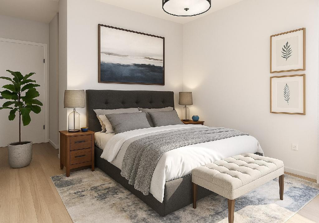 A két hálószoba a nappali két oldalán helyezkedik el, így ideális elosztású akár családnak vagy home office-hoz is.