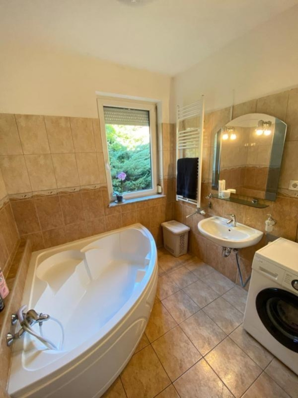 Kert: Füvesített, parkosított, kiépített automata öntözőrendszerrel és kerti csappal.