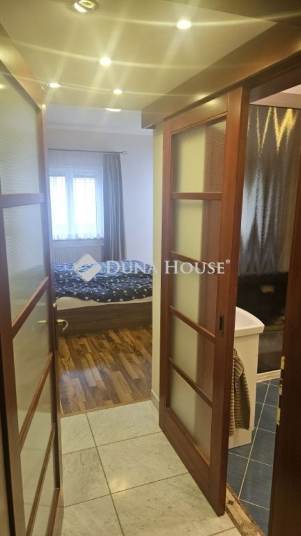 A lakásnak privát bejárata van az épületben a többi lakástól. Az előtérben van egy nagy beépített szekrény és bal oldalon egy WC is. Tovább haladva jobbra egy nagyobb halószaba található, amihez egy külön fürdőszoba van WC-vel, illetve ebből a szobából is ki lehet menni az udvarra. Az előtérből egyenesen tovább haladva jobbra található a konyha az étkező és a nappali, egyenesen pedig a közlekedő amiből a másik két szoba, illetve a második fürdőszoba nyílik. A nappaliból és az előbb említett két szobából közvetlen kijárás van a teraszra, kertbe. Kertben kellemes sütögető is ki van alakítva, illetve egy fészer a kisebb kerti eszközök tárolására.
