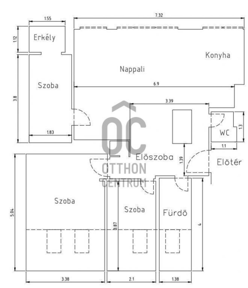 Amerikai konyhás nappalijához három külön nyíló szoba kapcsolódik, ami kényelmes életteret biztosít. A fürdőszoba és a WC külön helyiségben található.